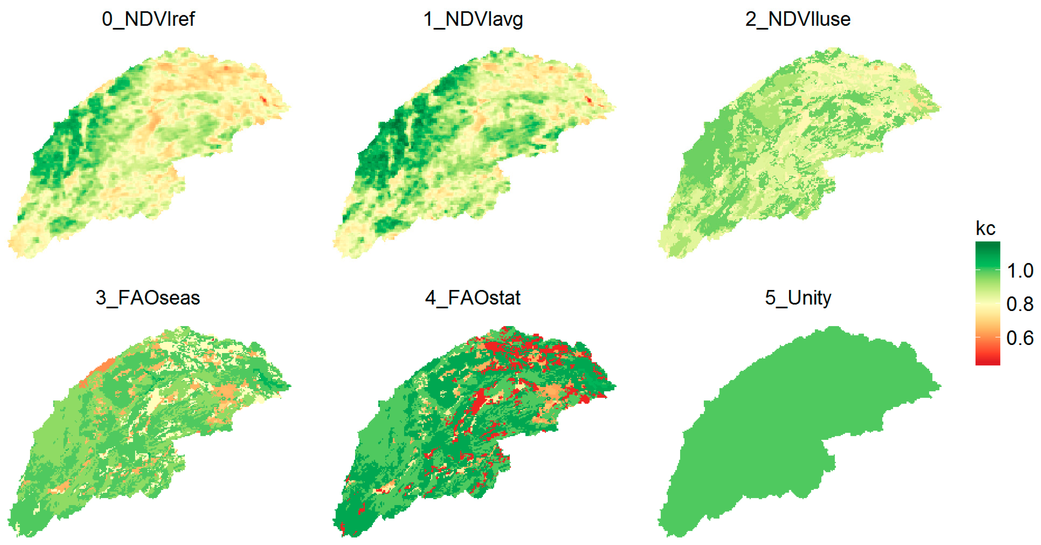 Figure 2 shows the maps of the mean annual crop coefficient for each of the parameterization methods. Methods 0 and 1 are based on pixel-level Normalized Difference Vegetation Index (NDVI). Methods 2–4 are based on the spatial distribution of the land use. Method 5 corresponds to a single value (1) for the entire basin.
