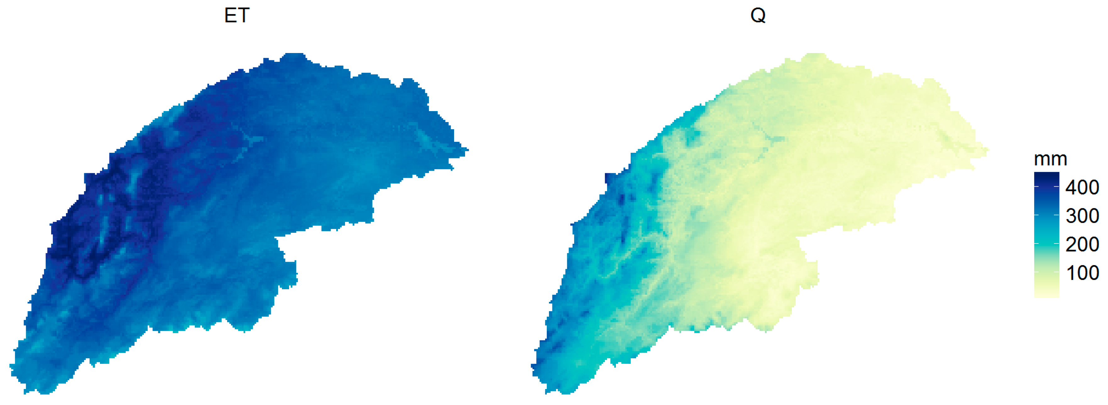 Maps of mean annual evapotranspiration and streamflow based on simulated outputs of the NDVI-based reference model (mm).