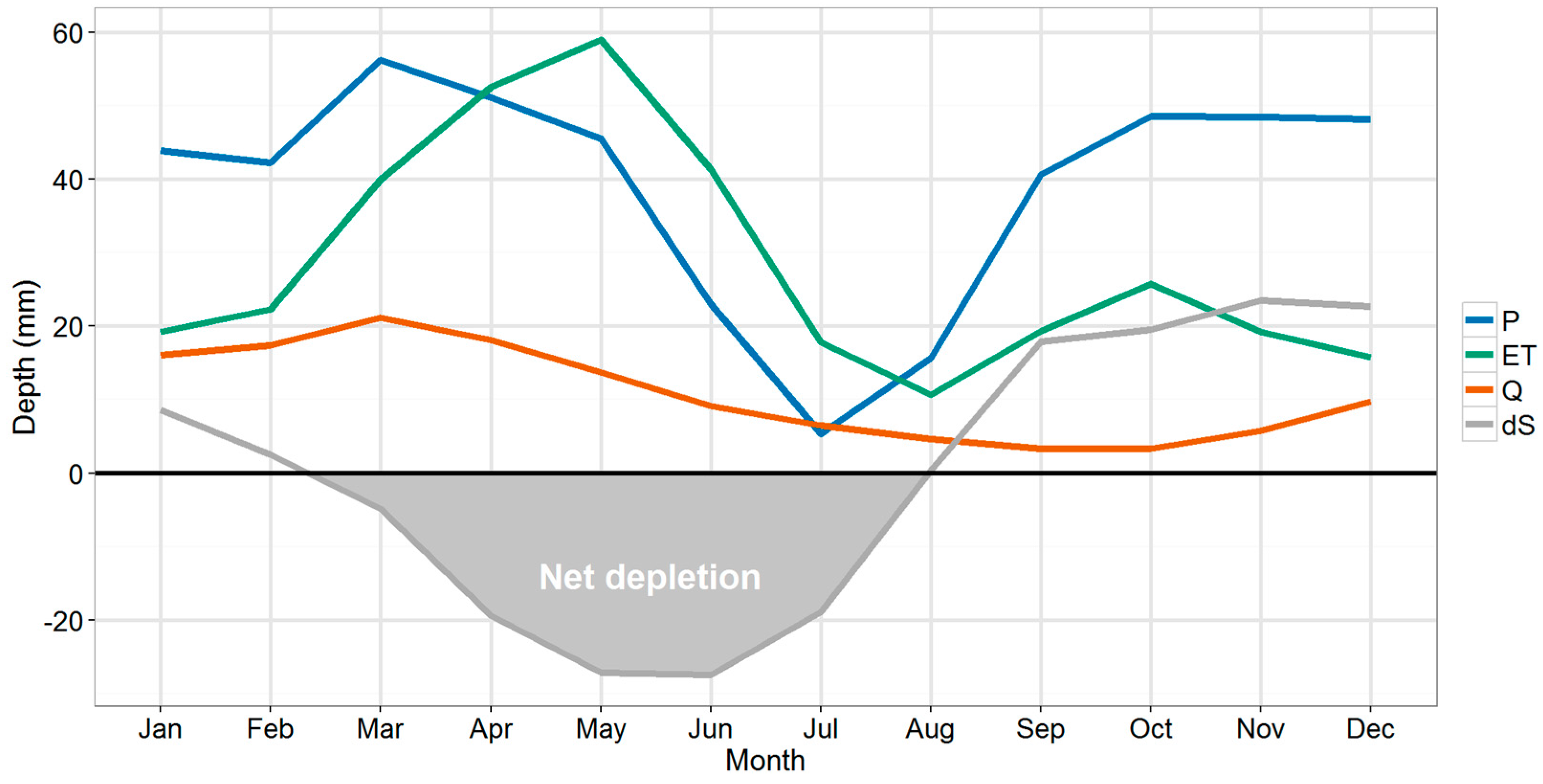Average monthly water balance of the basin including precipitation (P), evapotranspiration (ET), streamflow (Q) and change in soil and groundwater storage (dS) (all in mm).
