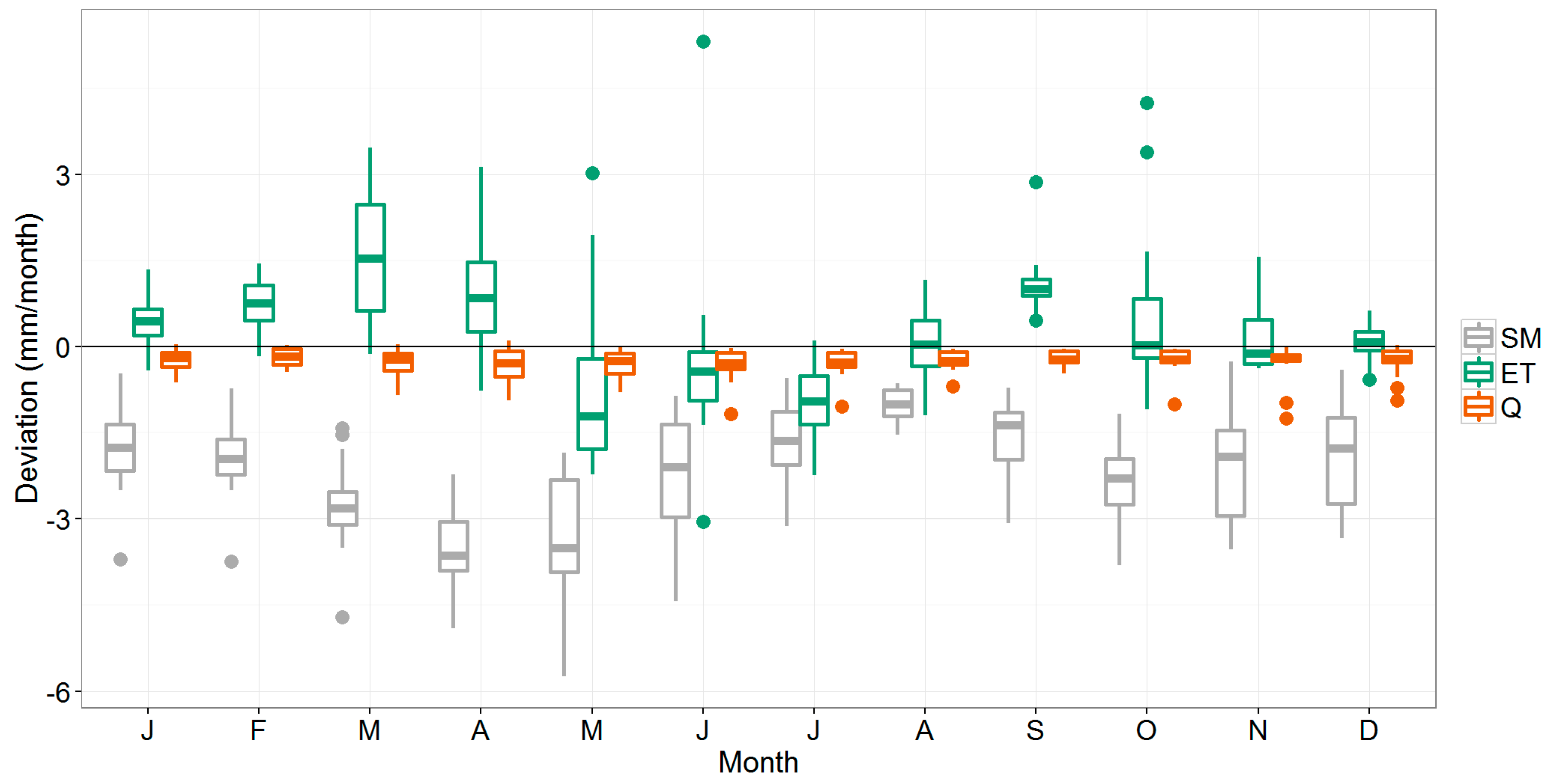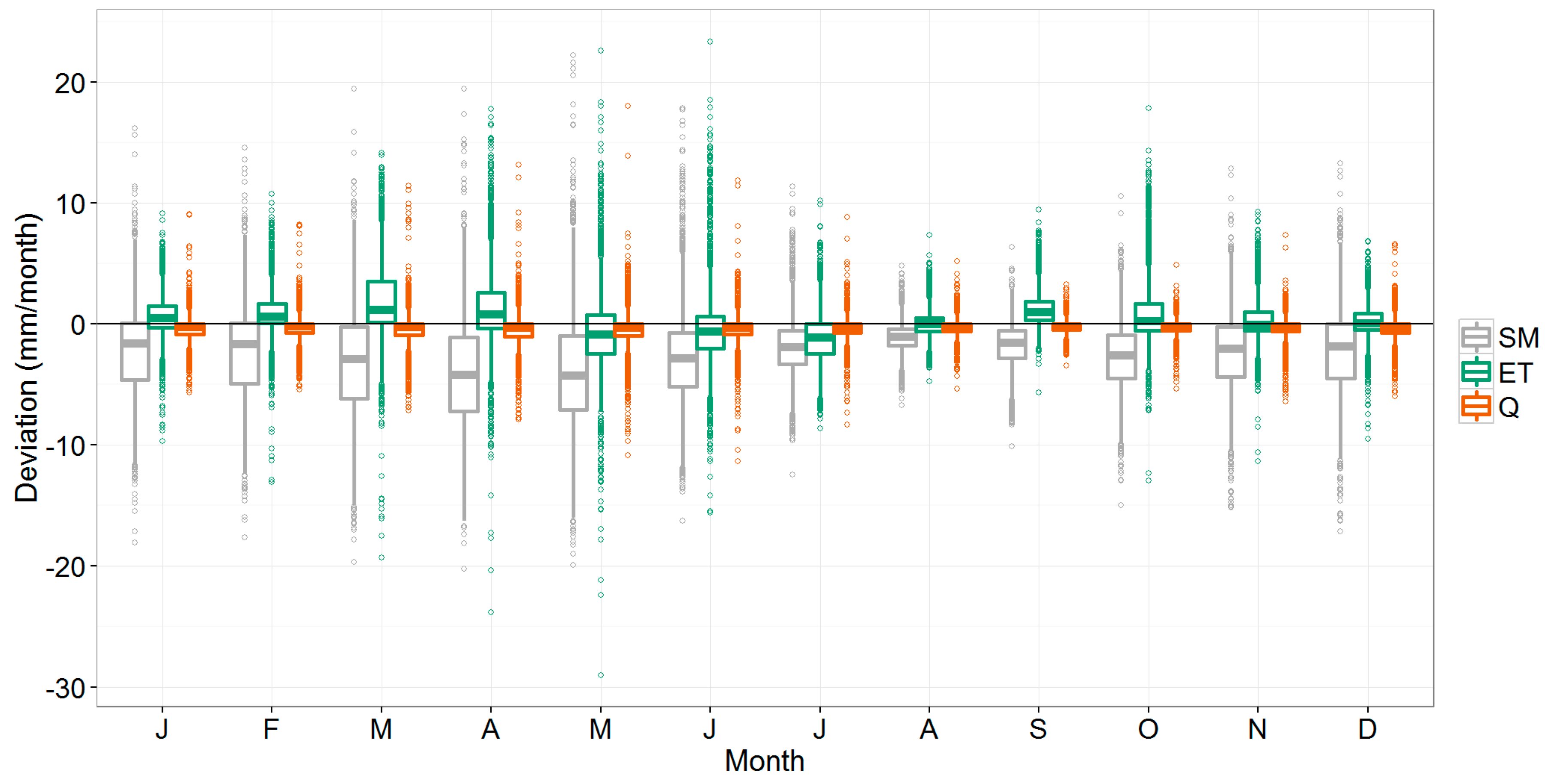 Boxplots showing the deviation (mm/month) of the 3_FAOseas method compared to the reference model for soil moisture (SM), actual evapotranspiration (ET), and streamflow (Q) at basin-scale. The boxes demonstrate the interquartile range in which the median is indicated as a line; the fences indicate the values that are within 1.5 times de interquartile range, and the dots the values outside of this range (“outliers”).