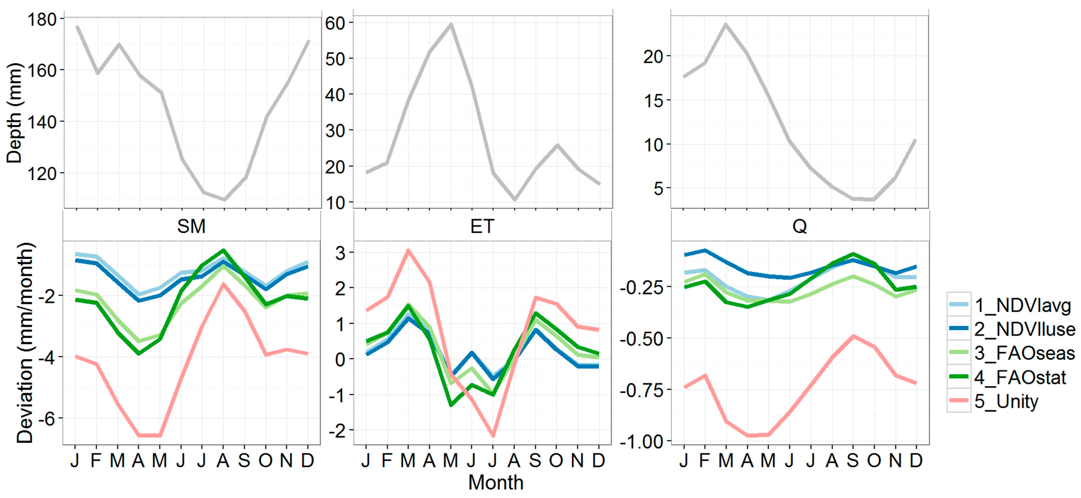 For ET, the mean monthly deviation is close to 0 for all methods, but as can be seen in Figure 6, there is a clear monthly pattern in the deviation: spring and summer deviations are positive, while in summer the deviations are generally negative. The highest values are reached in March (1.3 mm/month, corresponding to a relative deviation of about 3%). For 5_Unity, this goes up to 3.1 mm/month (7%) deviation.