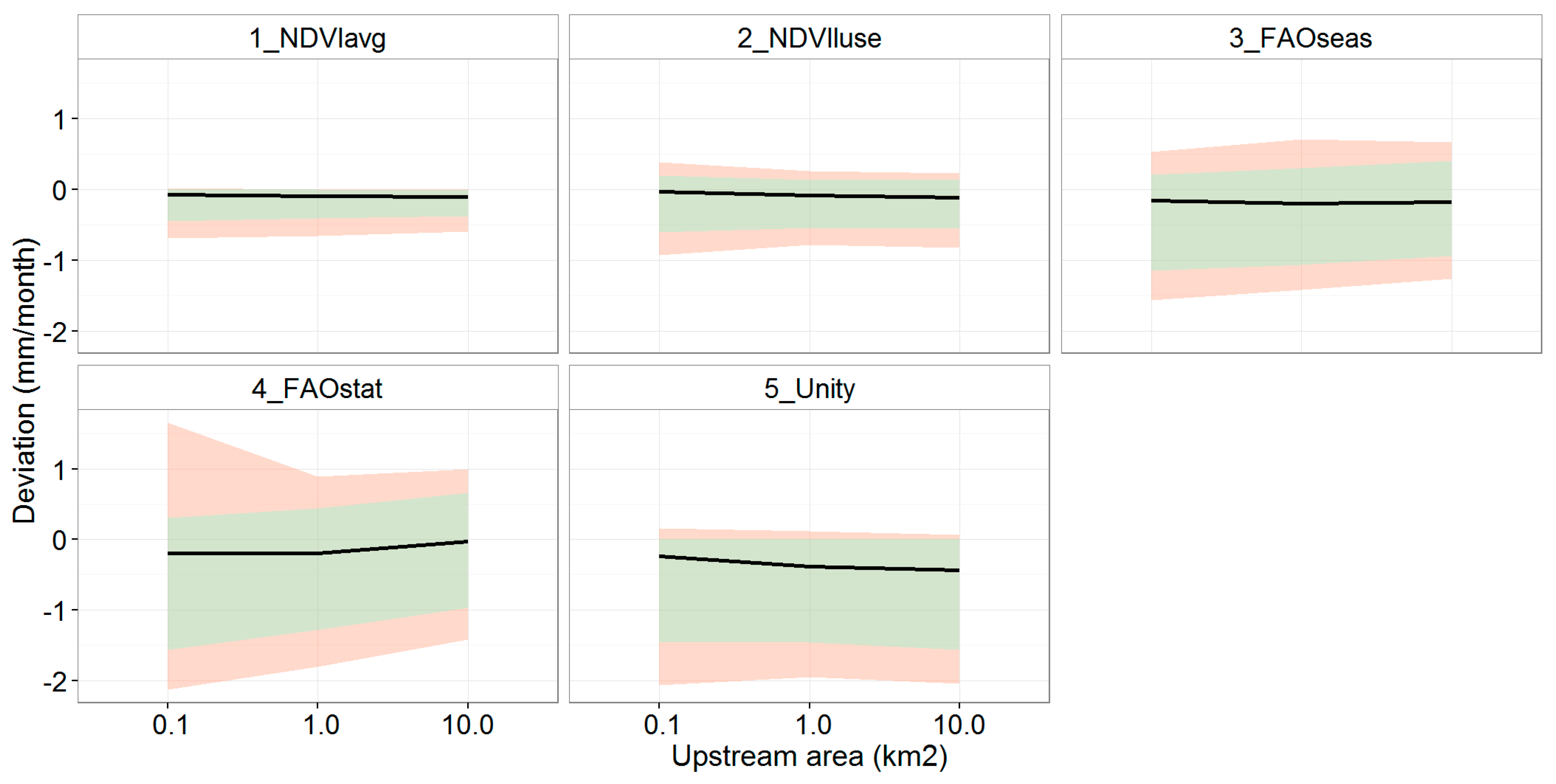 The deviations of the other methods from the NDVI-based reference model show similar trends as 3_FAOseas (Figure 6). The largest deviations are seen for 5_Unity, which assumes a crop coefficient = 1. For this parameterization method, the average monthly deviation of streamflow is −0.7 mm/month, which corresponds to a relative deviation of −10%. For the other NDVI-based methods, deviations are around −0.2 mm/month (−3%) and for the FAO-based methods around −0.3 mm/month (−4%).