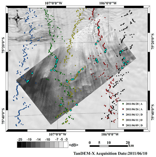 TanDEM-X intensity (10 June 2010) overlaid MODIS (8 December 2010); a composite of CryoSat-2 point data during the month of June in 2011 is plotted in colors to distinguish the acquisition dates; and locations of selected ground control points are in cyan diamonds.