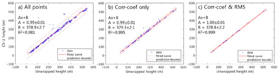Scatter plot between CryoSat-2 heights and the corrected unwrapped heights using linear least-squares approach when: (a) all of the available points are used as GCPs; (b) GCPs are selected with the correlation coefficients only; and (c) an additional threshold from RMS heights is used. The fitted curve is represented in red along with the prediction bounds in dotted line and the width is the minimum in (c).