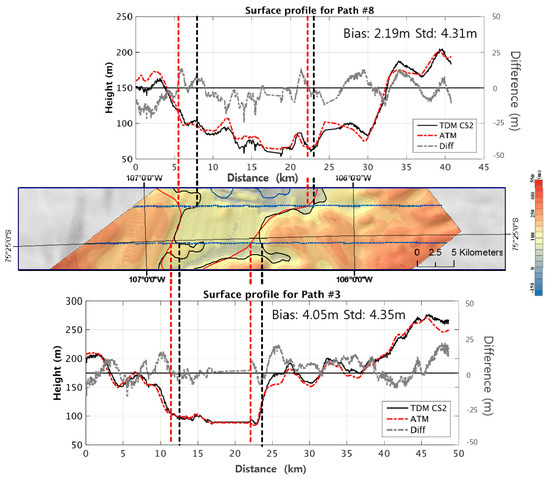 The second sub-site contains line 8 and 3 at where both profiles cross the grounding line in the western and eastern side and the floating ice tongue in-between (Figure 5). TDM_CS2 (red) and ATM (black) are well correlated with the mean bias of 2.19 m and 4.05 m and standard deviation of 4.31 m and 4.35 m for line 8 and 3, respectively.