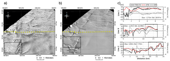 As indicated in a black rectangle box inside the images, the surface feature in the box migrated about 1 km north in six months inferring a flow velocity of around 2 km·a−1. This flow velocity is roughly close to the velocity of Thwaites Glacier around its grounding line of 3 km·a−1, estimated using TanDEM-X in 2011 [13]. The comparison confirms that rapid variation of surface feature is possible during a short period of time and so is the large height difference between ATM and TDM_CS2 at such an area.