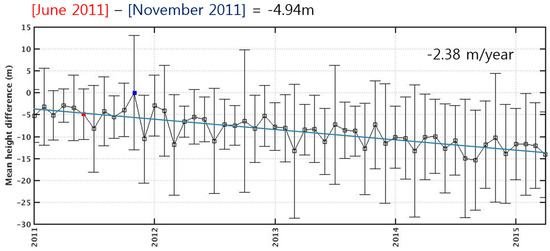 A cross-point analysis between CryoSat-2 and ATM on a monthly basis over the grounded ice sheet region between 75.35°S and 75.75°S shows a decreasing trend of surface height at a rate of −2.38 m/year. The red and blue square indicates June and November in 2011 corresponding to TanDEM-X and ATM acquisition, respectively. The relative difference between two periods is −4.94 m.