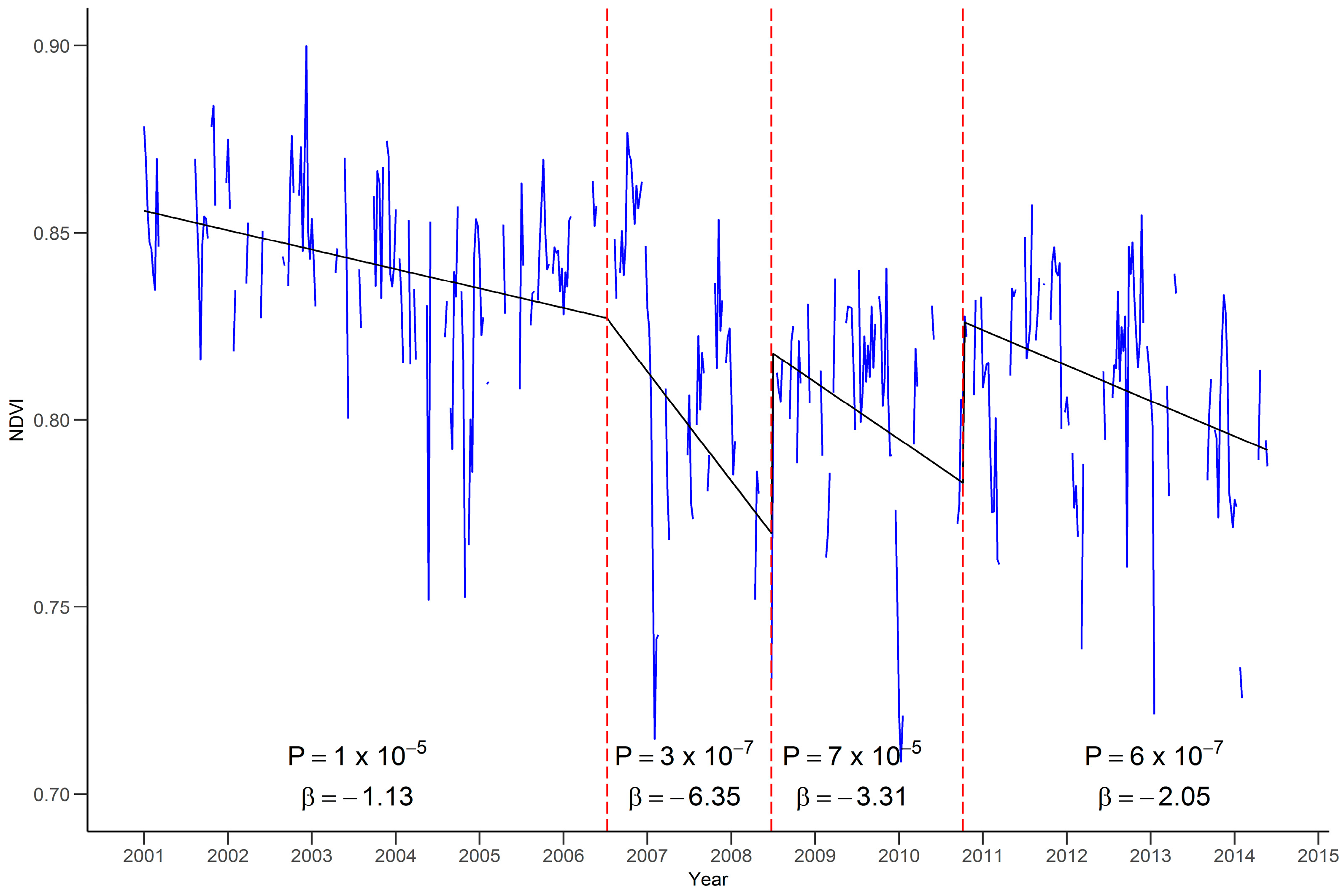As an alternative to conventional MODIS at-surface products, the Multi-Angle Implementation of Atmospheric Correction (MAIAC) is a novel cloud-screening technique that enhances land surface reflectance based on MODIS C6 Level 1B data [21]. MAIAC’s cloud detection technique yields a noise reduction by a factor of 3–10 compared to standard MODIS surface reflectance products (MYD09, MYD09GA) and derived composites (MYD09A1, MCD43A4, and MYD13A2-Vegetation Index) without the conventional assumption of Lambertian land surface behavior [19,20]. The improvements offered by MAIAC increase the number of viable clear-sky observations by a factor of 2–5 [19], which is especially valuable for monitoring vegetation dynamics in the persistently clouded tropics [42,43]. We used 8-day composite Normalized Difference Vegetation Index (NDVI) observations at 1-km resolution from January 2001 to June 2014 as input for the BFAST analysis.