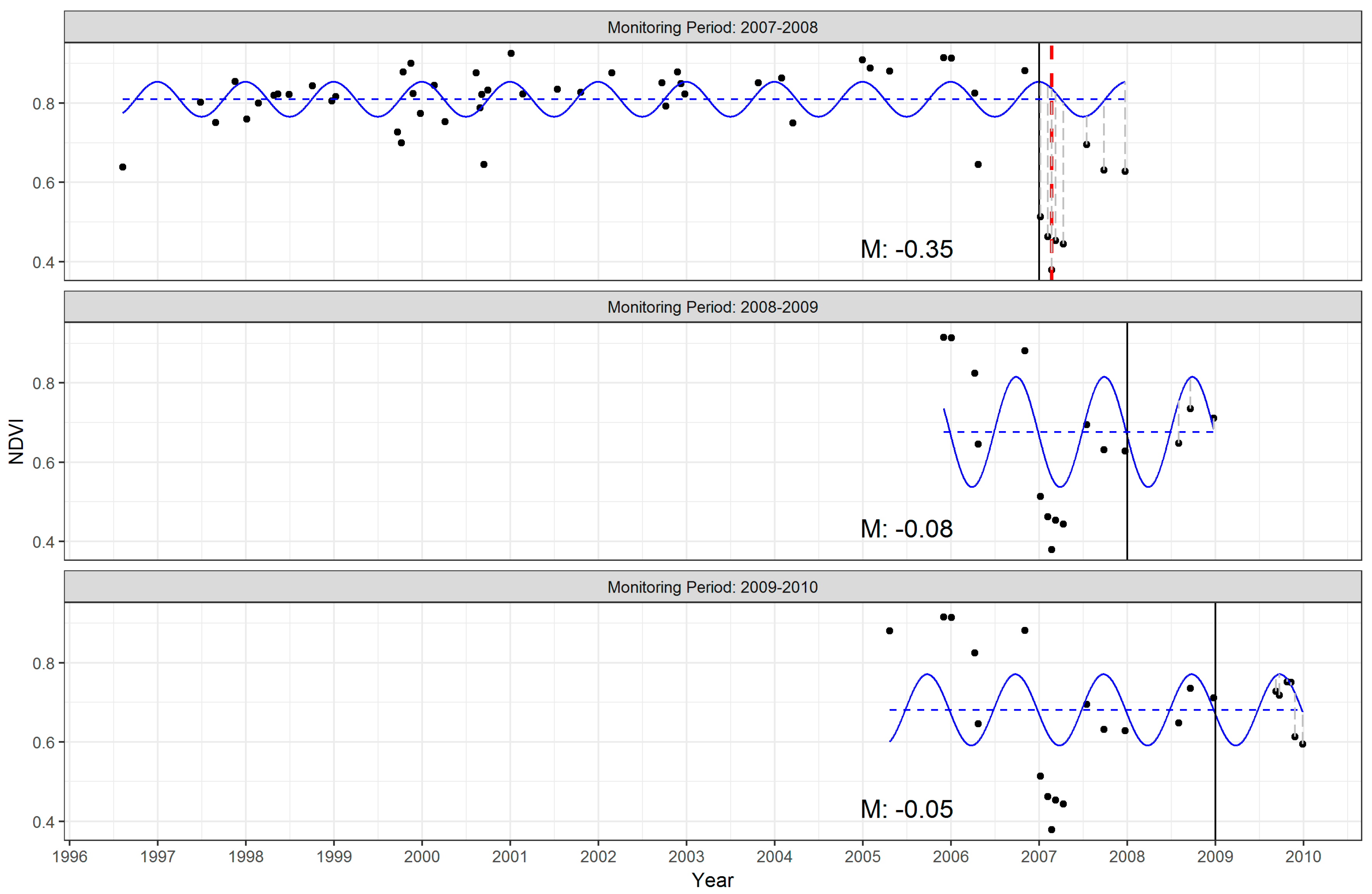 Example of pixel-level BFAST Monitor output using a 2007–2010 subset of the Landsat time series. Black solid lines denote the beginning of the monitoring period, black dots are observed NDVI observations, blue lines denote expected values from the fitted seasonal model, and grey dashed lines represent the residuals in each monitoring period. A breakpoint (dashed red line) is identified in early 2007 with a magnitude (M) of −0.35 but is not detected in 2008 or 2009. The historical periods for 2008–2009 and 2009–2010 are shorter than the 2007–2008 period because BFAST Monitor only includes preceding observations until the stable seasonal model breaks down.