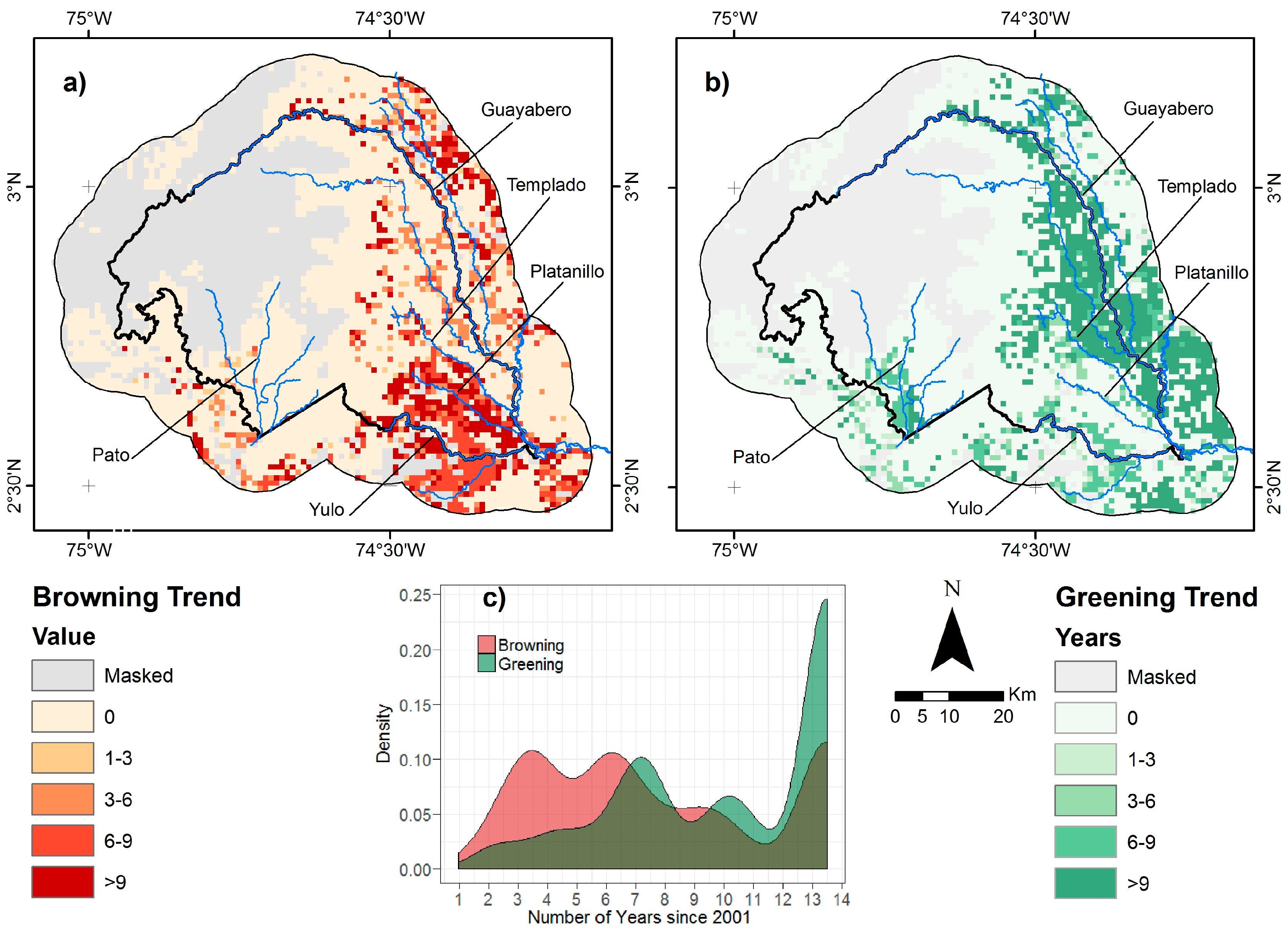 The most prominent browning region is in the southeastern corner of Picachos with small and scattered browning regions beyond the park’s northeastern perimeter near small settlements (Figure 4a). The watershed most affected by persistent browning is the Platanillo River watershed while the Templado River watershed is only affected at its southern extent where it merges with adjacent watersheds. The Yulo River watershed presented both browning and greening over our study period with more greening evident within Picachos. Greening clusters (Figure 4b) were found on a steeply sloped region in the park’s central-south region and surrounded by a river, the Rio Pato, and also in the central-eastern foothills along the large rivers, the Rio Guayabero and Rio Leiva. Within the park, 12,500 ha showed 13 years of consecutive browning, whereas the total area of persistent greening amounted to 27,700 ha.
