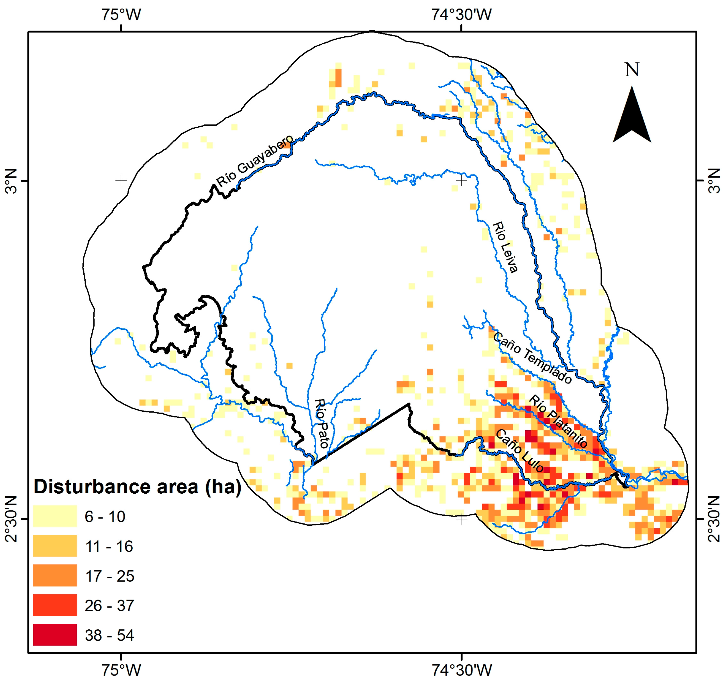 The abundance of disturbance events between 2004 and 2010 is likely a consequence of increased beef consumption in Colombia in the mid-2000s [71] and the growth of the livestock industry from 20 to 23 million head from 2001–2010 before stabilizing over 2011–2014 [72]. Furthermore, Picachos is sited in the provinces of Meta and Caquetá, provinces that saw a high growth of livestock production to supply the domestic market [73], which has encroached upon Picachos and its surroundings.