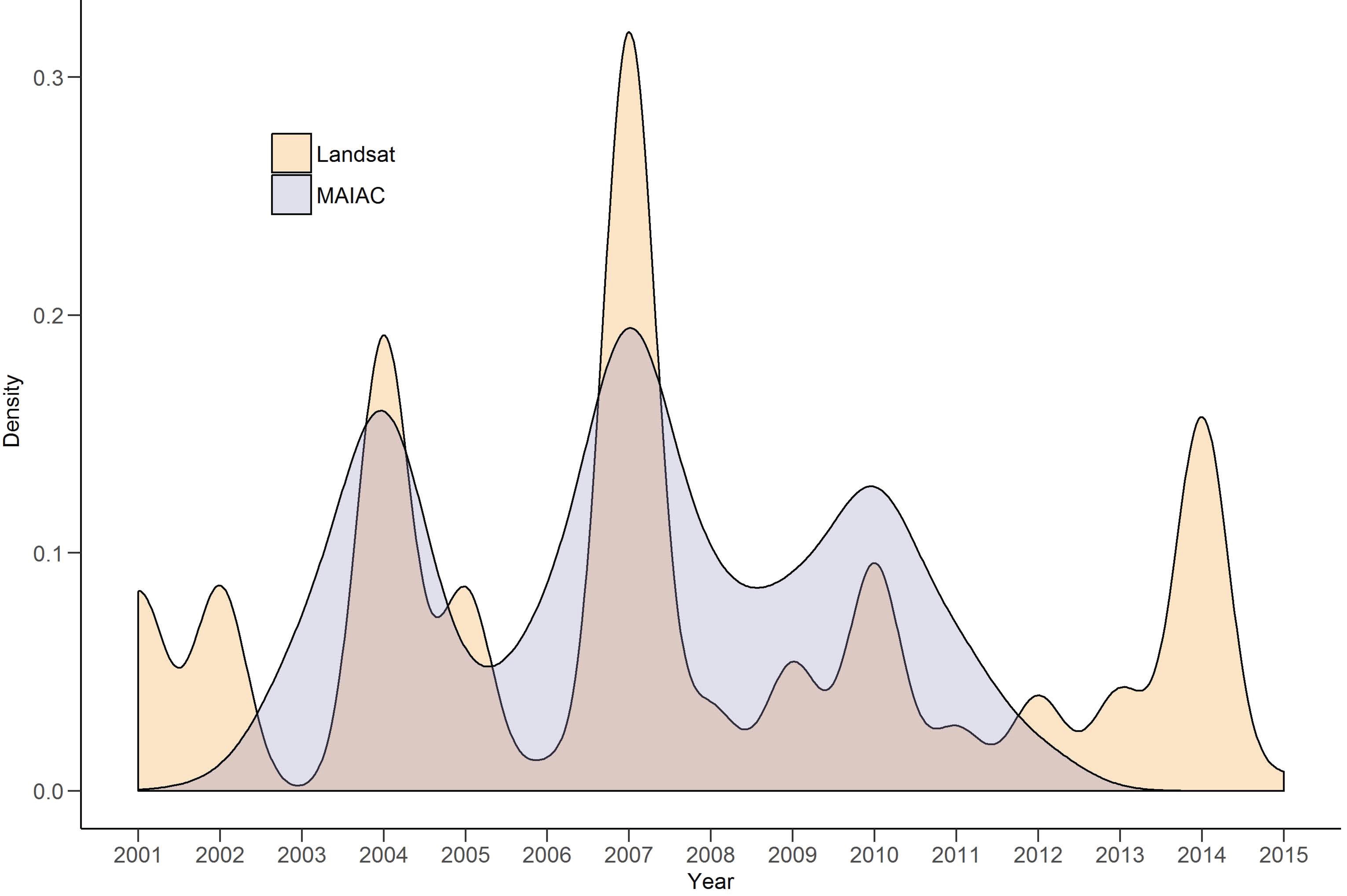 Comparison between breakpoint years detected using MAIAC and Landsat-based disturbance analyses across study area.