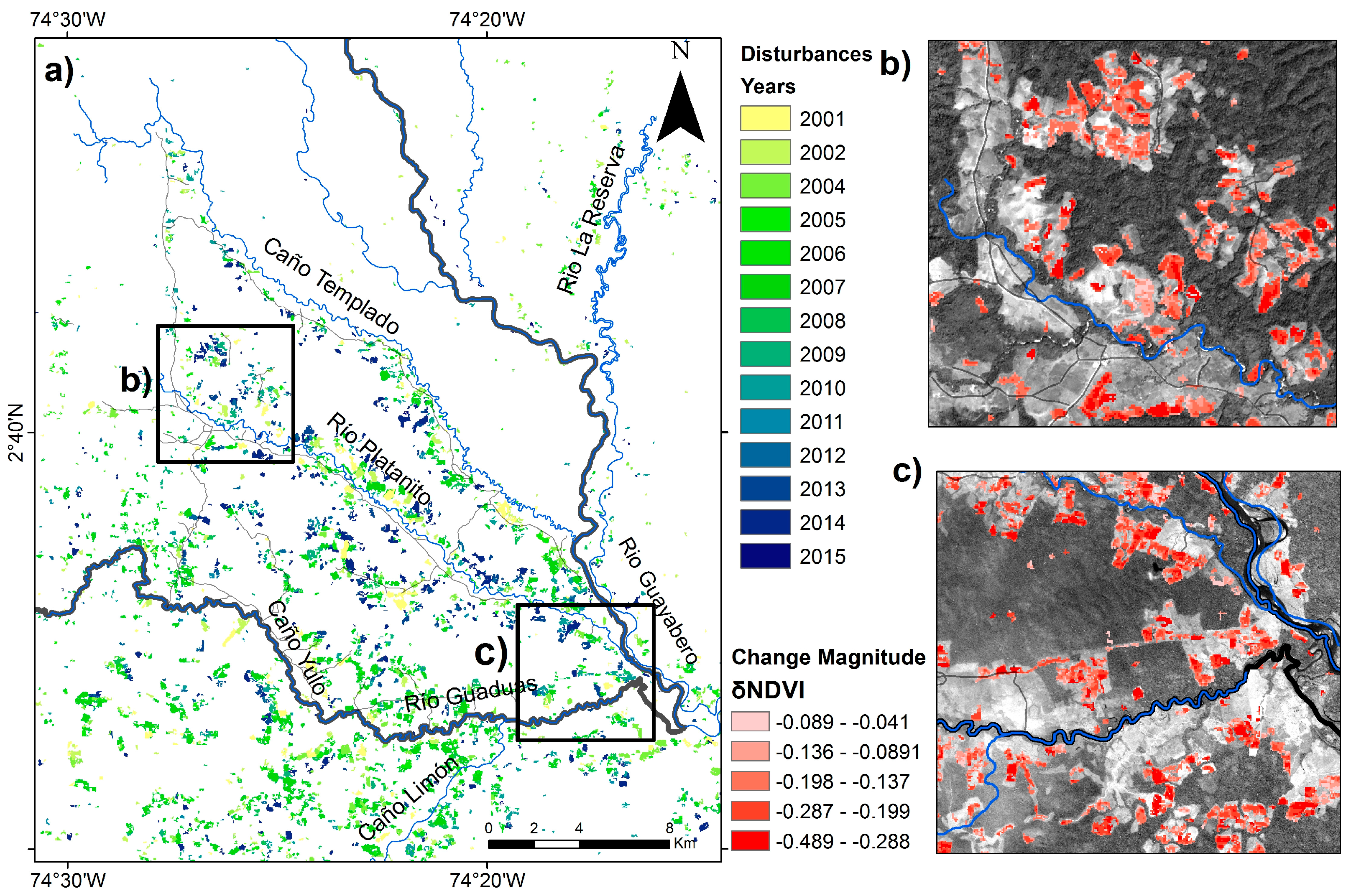 (a) Disturbance pattern in southeastern Picachos; (b) Change magnitude (δNDVI) subset over Platanillo sector and presence of unpaved roads (2015 RapidEye Red-Edge band background); (c) Subset for Rio Platanillo, Rio Guayabero, and Rio Guaduas (2014 RapidEye Red-Edge band background).