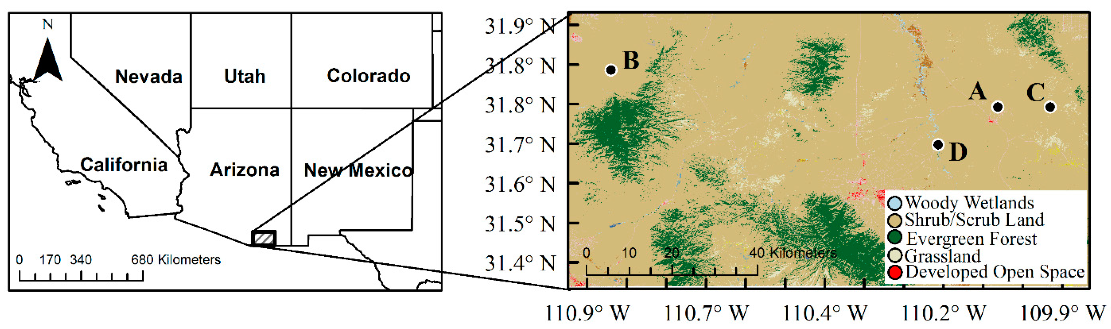- Knipper, K.; Hogue, T.; Scott, R.; Franz, K. Downscaling AMSR2 and SMOS soil moisture with MODIS visible and infrared products over southern Arizona. J. Appl. Remote Sens. 2017, in press. [Google Scholar]
