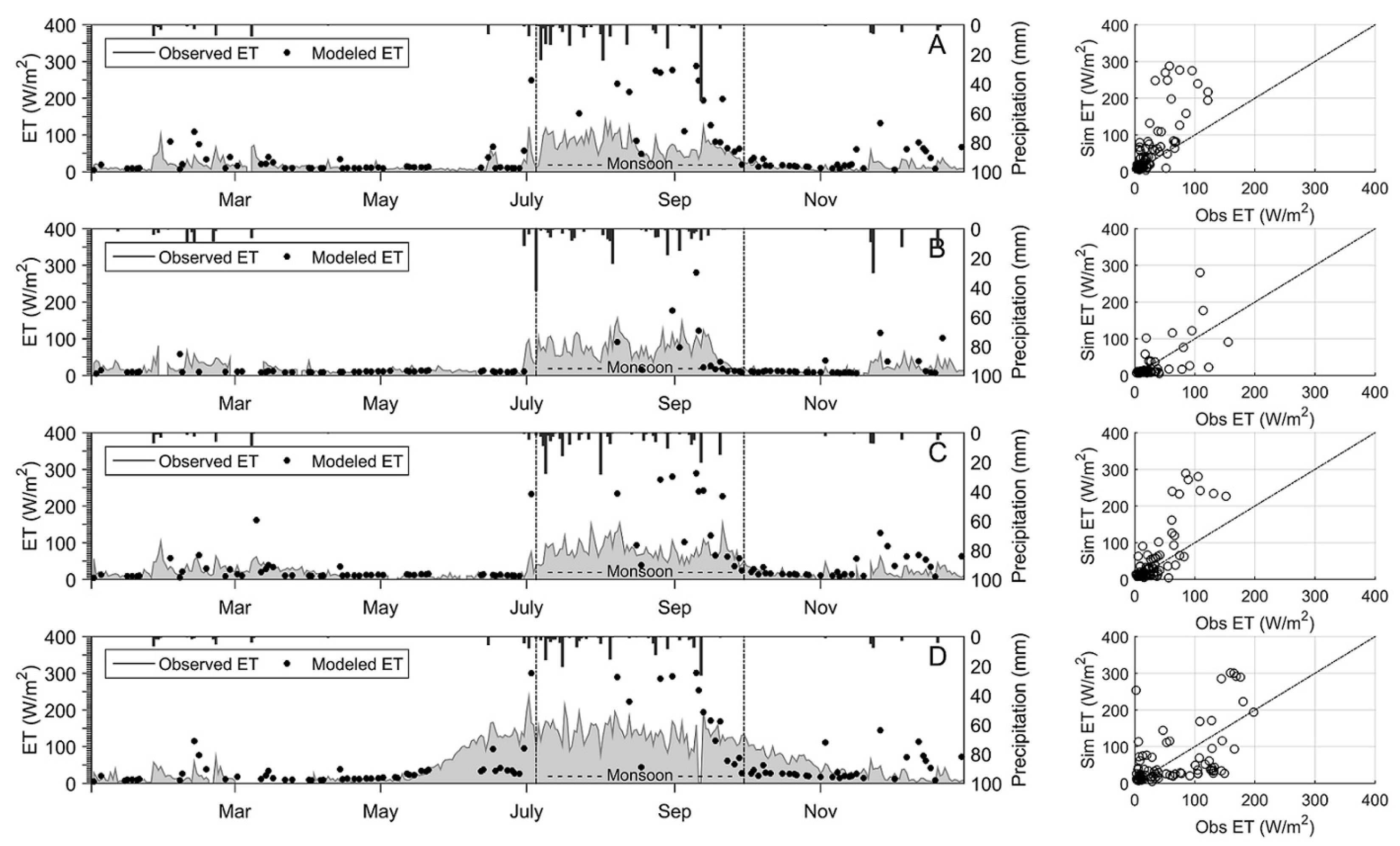 - Glenn, E.P.; Scott, R.L.; Nguyen, U.; Nagler, P.L. Wide-area ratios of evapotranspiration to precipitation in monsoon-dependent semiarid vegetation communities. J. Arid. Environ. 2015, 117, 84–95. [Google Scholar] [CrossRef]