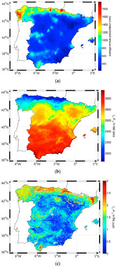 Figure 1 shows a precipitation map obtained averaging the annual precipitation of the eight years analyzed in this study (2005–2012), an average annual PAR image and the reference annual GPP for 2011 (both products will be described later).