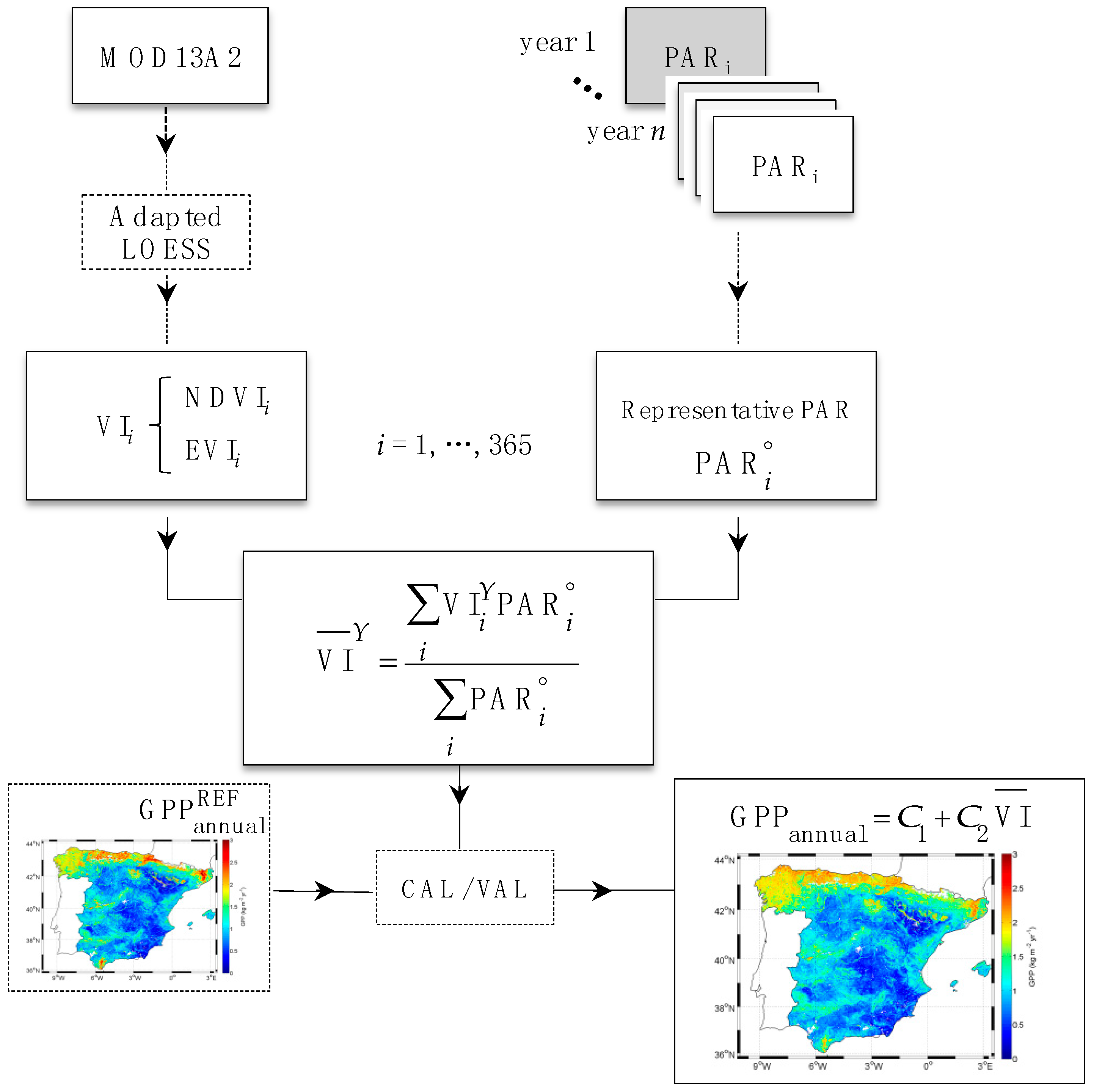 Flowchart of GPPannual estimation using the PAR-weighted VI (being VI = NDVI, EVI).