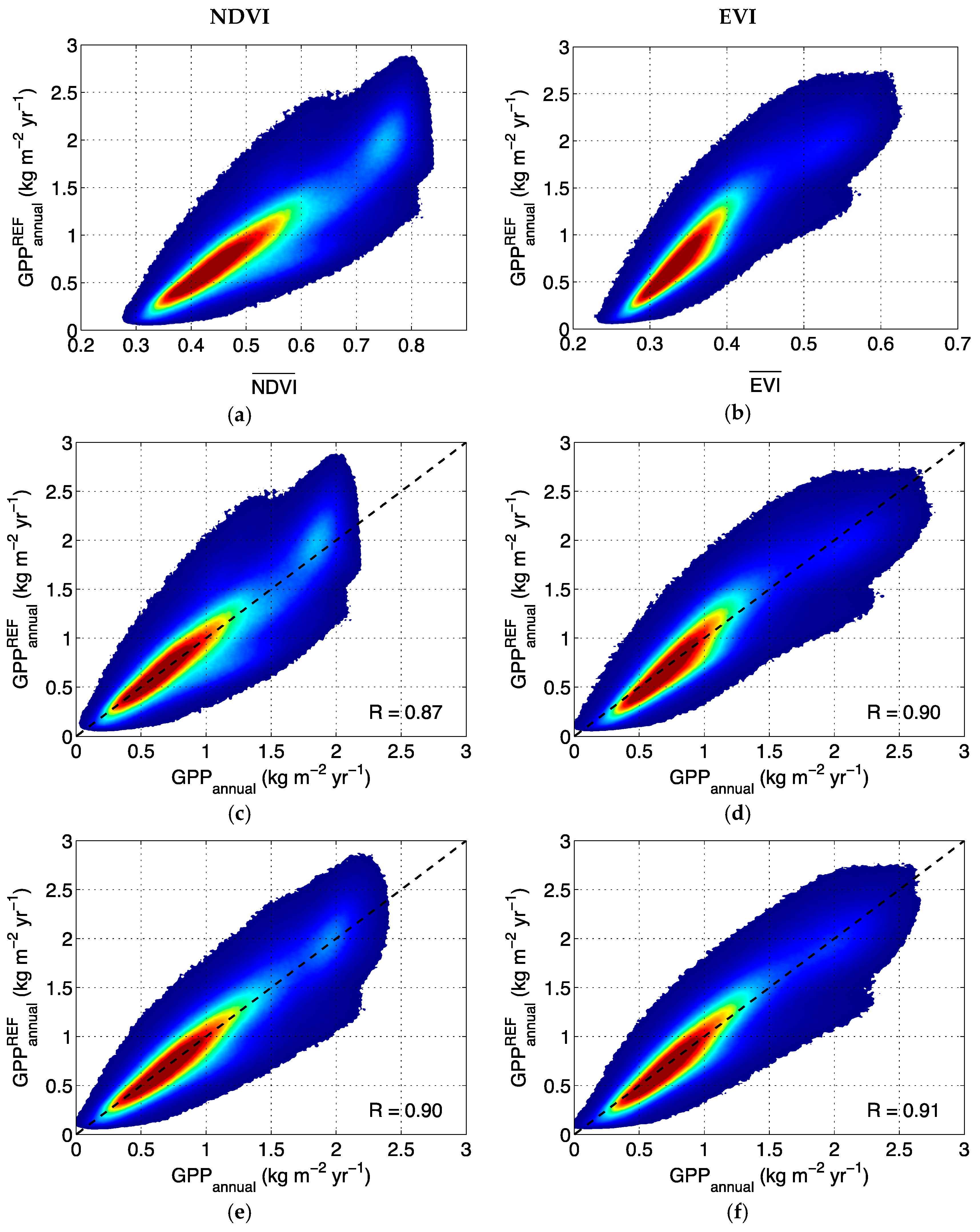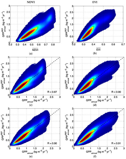 A density plot including all image pixels and all years evidences the correlation between: (a) and ; and (b) and . Correlation between and estimated by the semi-empirical model with a constant conversion efficiency using: (c) NDVI; and (d) EVI. Correlation between and estimated by the semi-empirical model with a conversion efficiency depending on the land-cover type using: (e) NDVI; and (f) EVI (Reddish areas correspond to the highest point density. The dashed line is the 1:1 bisector).