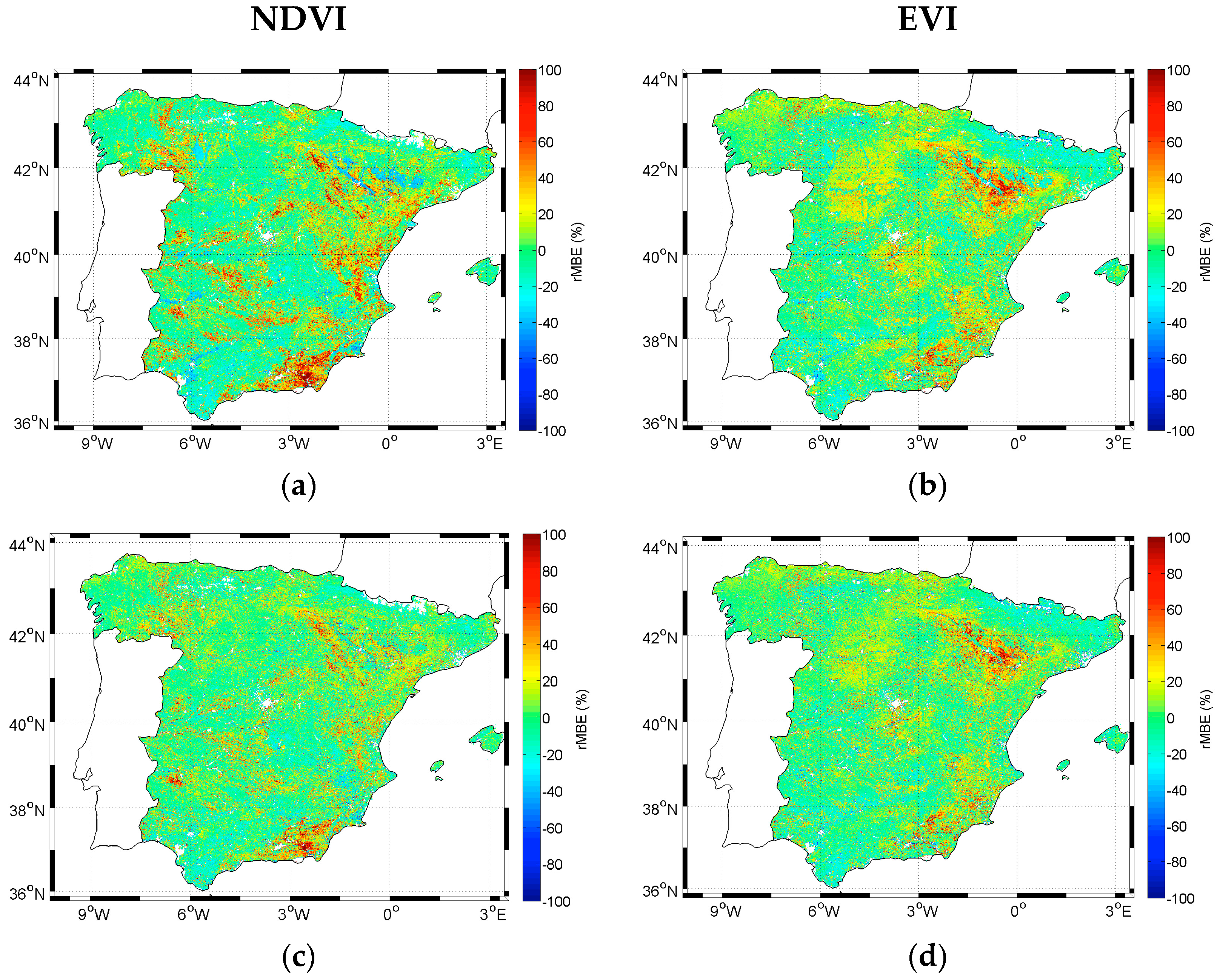 The different vegetation types present rather similar statistics. Cultivated areas, croplands and herbaceous show high coefficient of correlation values, and irrigated lands and shrubs show the lowest values, though still relatively high. The lower rMBE values correspond to herbaceous and needle-leaved forest. When analyzing the spatial dependence of the estimates uncertainties (average for all the years), for example in terms of the rMBE, it is observed that most of the estimates present a bias around zero (Figure 6), and the different vegetation types present rather similar values. When using constant regressions coefficients, for the estimates from both NDVI (Figure 6a) and EVI (Figure 6b), 20% of the pixels have |rMBE| ≤ 5% (and 68% of the pixels have |rMBE| ≤ 20%). When using coefficients depending on the vegetation type, the 24% of pixels have |rMBE| ≤ 5% (and 73% have |rMBE| ≤ 20%) for NDVI (Figure 6c) and EVI (Figure 6d). The rMBE image using both constant and vegetation-type dependent values of C1 and C2, shows that in the second case the red and blue areas (overestimation and underestimation) are reduced (Figure 6). That is, when considering variable C1 and C2, the bias of the semi-empirical model is slightly reduced. However, when using NDVI some areas located in W (small area with very low vegetation cover) and SE Spain still present overestimates of ca. 100%. Something similar occurs in the semiarid Ebro basin in NE Spain when using instead the EVI. Those areas located in SE and NW Spain comprise semiarid lands with a very low productivity (see Figure 1c). Then, although the bias is important in relative terms, it is not so in absolute terms because the aforementioned areas have very low GPP. Other areas presenting bias between 20% and 40% can also be identified, which are not clearly associated with a vegetation type. The presence of some areas with significant bias might be associated with the thematic map used. However, the use of an ecosystem functional type map [38] produces no improvement. The global statistics for the validation when using this alternative map with NDVI are R = 0.88, rMBE = −0.010, rMAE = 0.18, and rRMSE = 0.2. That is, the correlation between the model estimates and the reference GPP is decreased, and the uncertainties are slightly increased, with respect to those obtained using the hybrid classification map.