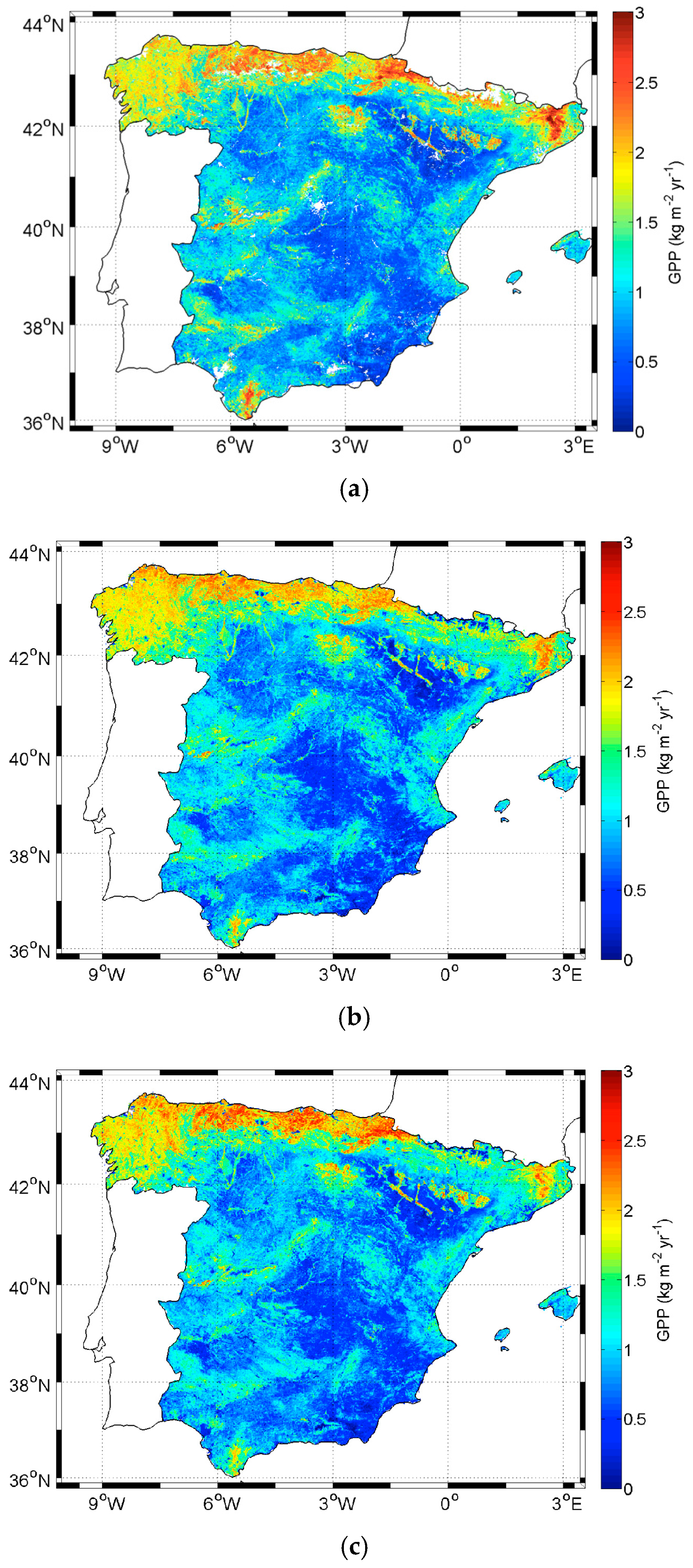 The calibration/validation process, however, does require a reference GPP product and, obviously, the higher the quality of the reference GPP product, the better the performance of the semi-empirical model. In this study, a daily GPP product optimized for the study area has been used to calculate the reference annual GPP instead of using the annual GPP from MODIS (MOD17A3). Although both products show a temporal consistency [4], our product benefits from: an accurate PAR product, a land-cover map more adapted to the study area and a water stress factor that better accounts for the photosynthesis reduction during the summer water shortage. Nevertheless, the MOD17A3 product can be also used as reference to calibrate the model (and could even be recommended for a global study). In order to further test the methodology robustness, the calibration/validation process has been repeated using MOD17A3 as reference for both VIs and considering both constant regression coefficients and coefficients depending on the vegetation type (Table 6).