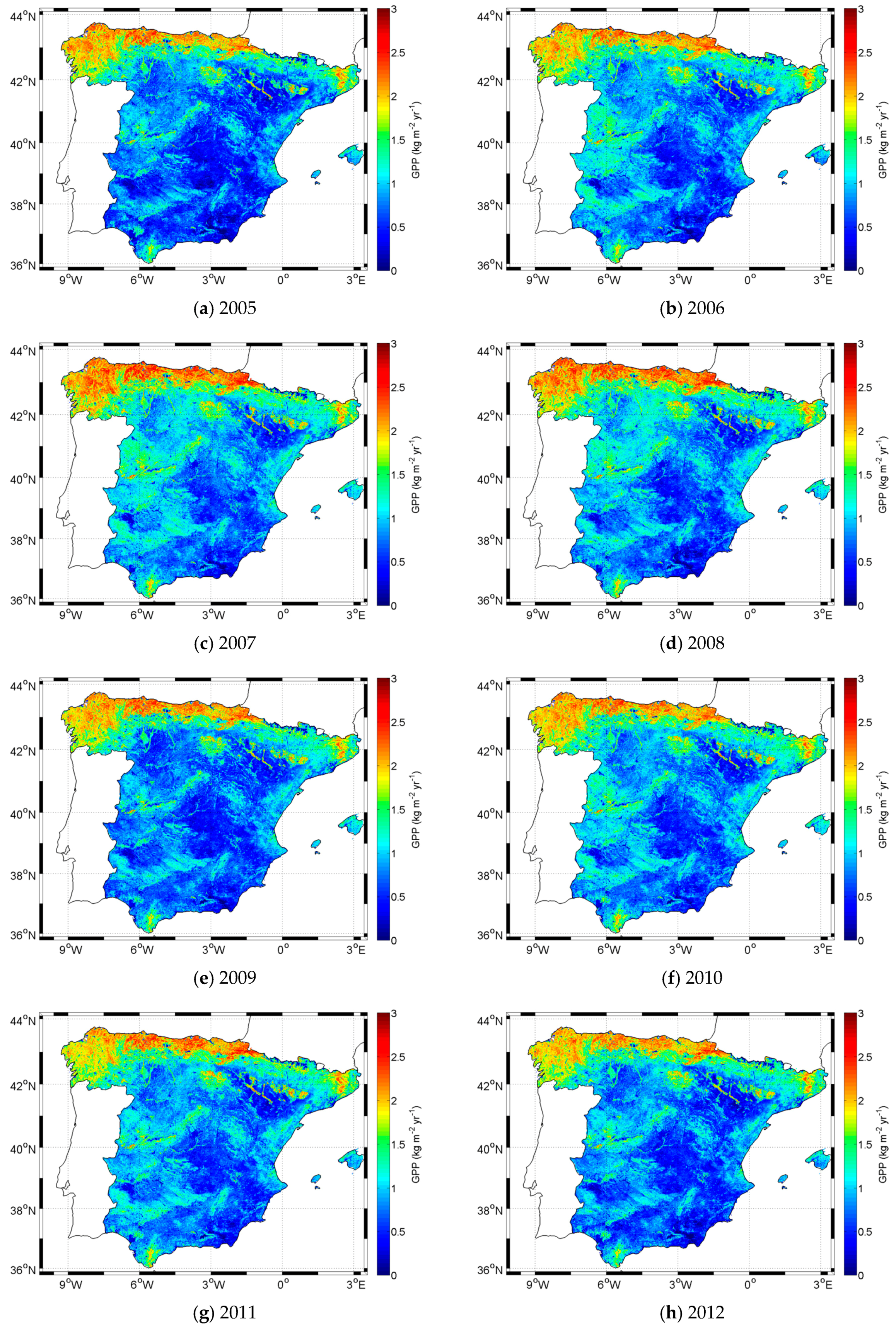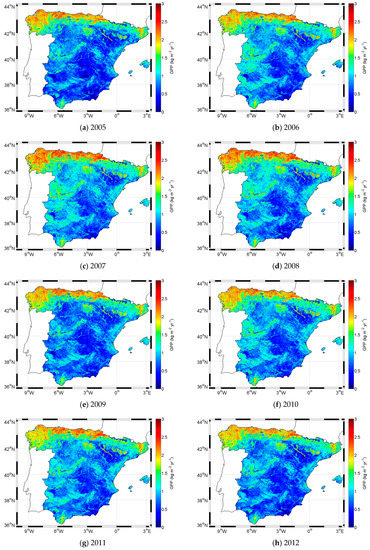 Finally, as an example, Figure 8 shows the annual GPP images for the 2005–2012 period obtained using the proposed model with EVI and the coefficients in Table 4. The observed inter-annual variability in GPP is influenced mostly by changes in structural parameters of the vegetation, and thus by the EVI, which is connected with precipitation pattern. When precipitation diminishes, for example in 2005 [47], a reduction in GPP is observed. In a wetter year, such as 2010, an increase of GPP is shown.