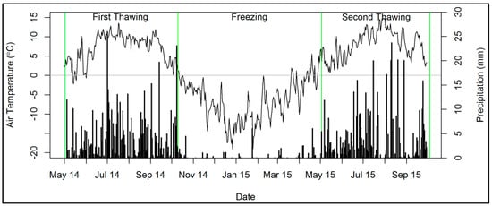 TLS was performed using a FARO Focus3D X130 3D laser scanner, which is a high speed 3D scanner for obtaining detailed measurement and 3D documentation. This scanner employs a laser to produce highly detailed 3D images of complex environments and geometries within minutes. The resulting image is an assembly of millions of points in color, which provide an exact digital reproduction of the current conditions [,,]. The distance accuracy of the FARO Focus3D X130 is up to ±2 mm, with a range from 0.6 m to 130 m, and noise reduction of 50%. Approximately 26 scans were made in order to create a 3D point cloud of the entire site, with more than 1.1 million points. The TLS scanner and six Trimble 5700 GNSS systems were deployed in the field area between May 2014 and October 2015, where the site was monitored four times with two thawing periods and a freezing period (Figure 3). The three freeze–thaw phases are referred to as “first thawing” (May 2014 to October 2014), “freezing” (October 2014 to May 2015), and “second thawing” (May 2015 to October 2015) in the following.