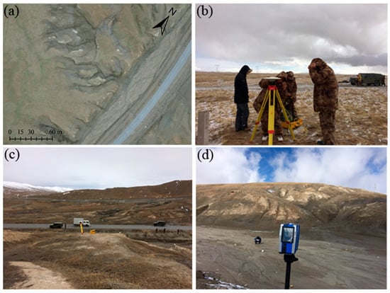 Slope failures in permafrost regions have motivated the development of various monitoring techniques, such as total station, tension crack monitoring, microseismic monitoring technology, electrical resistivity tomography (ERT), terrestrial photogrammetric methods, global navigation satellite system (GNSS), slope stability radar, interferometric synthetic aperture radar (InSAR), and terrestrial laser scanning (TLS). Many studies have applied these monitoring techniques to slopes in permafrost. For example, steel rods spaced 10 m apart were deployed in transects transversal to the slope headwall to allow manual monitoring of slope retrogression in a permafrost region of the QTP, China []. Inclinometers were also used to detect changes in the downslope configuration of soils to obtain permafrost creep measurements in West Valley of Great Bear River, Canada [,]. Microseismic monitoring systems were installed at the Matterhorn (NW Alps) and nearby Lecco (Italy) to analyze the microseismic activity and facilitate rock slope stability investigations [,]. ERT measurements were employed to monitor mountain permafrost evolution in a seven-year study at Schilthorn, Swiss Alps []. Light detection and ranging (LiDAR) was deployed to assess rock slope failures in the permafrost high-mountain environments on the Monte Rosa east face [,]. InSAR technology was employed to measure surface deformation over permafrost in the QTP, North Slope of Alaska, USA, and the Mackenzie Valley, Canada [,,,,,]. TLS surveys have been conducted using three-dimensional (3D) laser scanners to describe and quantify the permafrost dynamics in an Arctic glacier basin, including rock slides and creeping [,], but the application of TLS in the QTP has been rare.