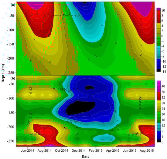 Figure 5b shows the soil moisture variations during freeze–thaw cycles. The active layer thawed completely, and the soil moisture contents were higher in the bottom and surface of the active layer, with higher soil moisture near the bottom and lower soil moisture in the middle. This was possibly attributable to the compacted clay near 150 cm, and the bottom of the active layer contained clay with thick underground ice. After the air warmed up sufficiently, the thaw front started to move down into the soil, and the underground ice in the active layer began to melt, where the contour lines of the soil moisture became dense again. As the thaw front moved downward slowly, the underground ice liquefied above the thaw front. The liquid water and snowmelt moved downward under the action of gravity. As the soil underwent the freezing process, the contour lines of the soil water content became more intensive and the soil water content changed sharply during this stage, where a large volume of liquid water froze. As the frost front moved downward gradually from the ground surface, the soil moisture moved upward gradually due to the effect of the soil temperature gradient. During the freezing period, most of the soil water was frozen into ice and only a small amount of unfrozen water moved upward under the temperature gradient.