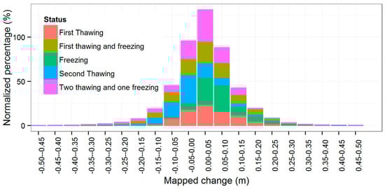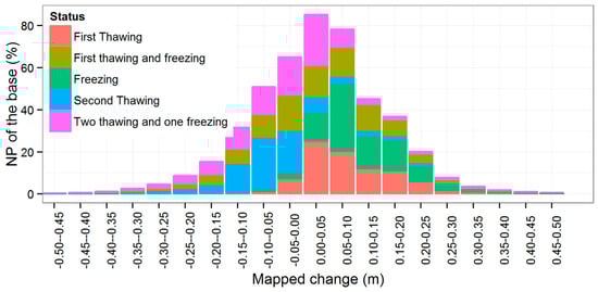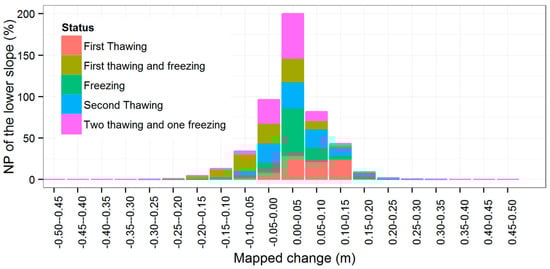 As shown in Table 2 and Table 3 and Figure 6c, the changes in elevation also ranged from 0.50 m to −0.50 m during the freezing stage. The changes in the elevation of the slope were mainly from 0 m to 0.10 m during one freezing period. The proportional changes in elevation between 0 m and 0.25 m, with an interval of 0.05 m, were 37%, 36%, 12%, 8%, and 4%, respectively (Figure 7). The upper slope exhibited an uplift trend during freezing conditions, where a small area of the lower slope and radial cracks in the slope exhibited a subsidence trend, although they only accounted for approximately 3% of the slope, which suggests that the major structure of the slope and the base comprised an upward swelling of the soil due to freezing. We consider that the slope in the permafrost was attributable to a frost heave phenomenon during the freezing period. Frost heave may also have occurred in most of the positions of the base.