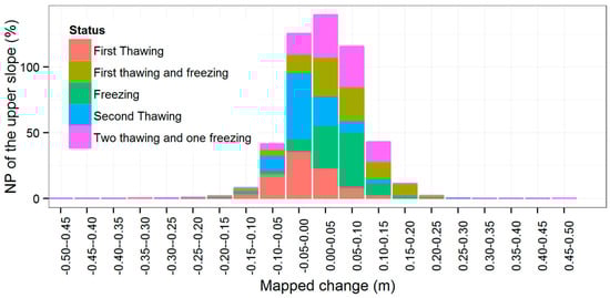 From May 2014 to October 2015, the slope in the permafrost underwent two thawing periods and one freezing period. During the two thawing periods, the major structure of the slope exhibited subsidence trends, but the major structure of the slope exhibited an uplift trend only in the single freezing period. It can be inferred that the surface volume was increased by heaving after freezing once due to the increased presence of ice as it grew toward the surface, which compensated for the loss of thawing twice, and there was still an upward swelling of the soil. Figure 6d,e compares the terrain during the thaw–freeze cycles after going through a freezing period, where regardless of whether there was one thawing or two thawing periods, the major structure of the slope still exhibited an uplift trend, which suggests that the upper slope still increased in size. The changes in the elevation of the slope were mainly from 0 m to 0.10 m during the two periods. The proportional changes in elevation between 0 m and 0.20 m in the two stages, with an interval of 0.05 m, were 40% and 57%, 28% and 27%, 16% and 12%, and 10% and 1%, respectively (Figure 7). The southern part and northern part of the base exhibited different deformation trends, i.e., uplift for the southern part and subsidence for the northern part. Despite the overall uplift of the slope, the lower slope and radial cracks in the slope showed some signs of slumping.