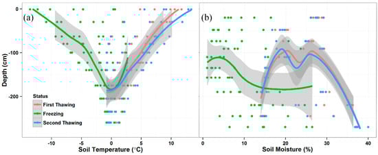 Monthly mean soil temperature and moisture contents in different layers during the two thawing periods and one freezing period: (a) Soil temperature (°C); and (b) soil moisture (%). The colored lines are the non-linear average values.