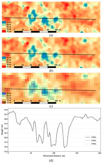 Examples of CHMs generated at the different spatial resolution: (a) CHM1 (1 m); (b) CHM2 (2 m); and (c) CHM5 (5 m); and (d) the profile across a segment of the research area for each CHM.