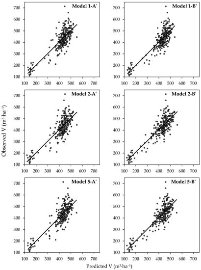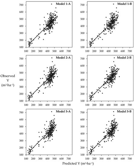 Table 6 shows results of stepwise regression and validation for six selected stand-level volume models. The R2adj for the modeling dataset for the first (1-A, 2-A, 5-A; hereinafter referred to as A models) and second (1-B, 2-B, 5-B; hereinafter referred to as B models) group of models is 0.83 and 0.84, respectively, indicating a good model fit (Table 6). For the validation dataset, both groups of models exhibit just slightly lower R2adj values than for modeling dataset. R2adj for modeling and validation dataset differ by <0.01 (model 2-B) or by only 0.01 (models 1-A, 1-B, 5-B) and 0.02 (models 2-A, 5-A). In addition, the accuracy measures (RMSE, RMSE%, MD, MD%) calculated for the validation dataset show just slightly less accurate volume estimates than for the modeling dataset. The differences between the RMSE% values calculated for the modeling and validation datasets range from 0.39% to 0.90%, whereas the differences between the MD% values for the two datasets range from −0.78% to −0.98%. A good agreement between the results obtained for the modeling and validation datasets indicates that the regression models provide reliable predictions.