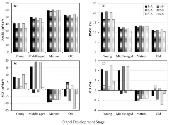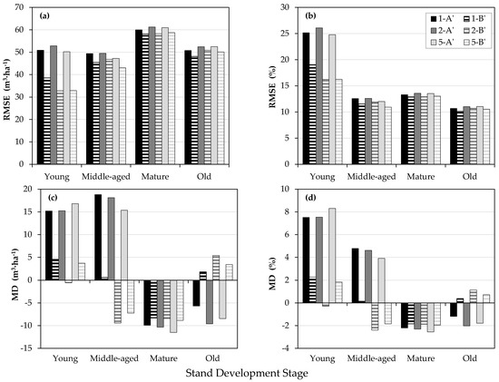Validation results by stand development stages (young, middle-aged, mature, old): (a) root mean square error (RMSE); (b) relative root mean square error (RMSE%); (c) mean difference (MD); and (d) relative mean difference (MD%).