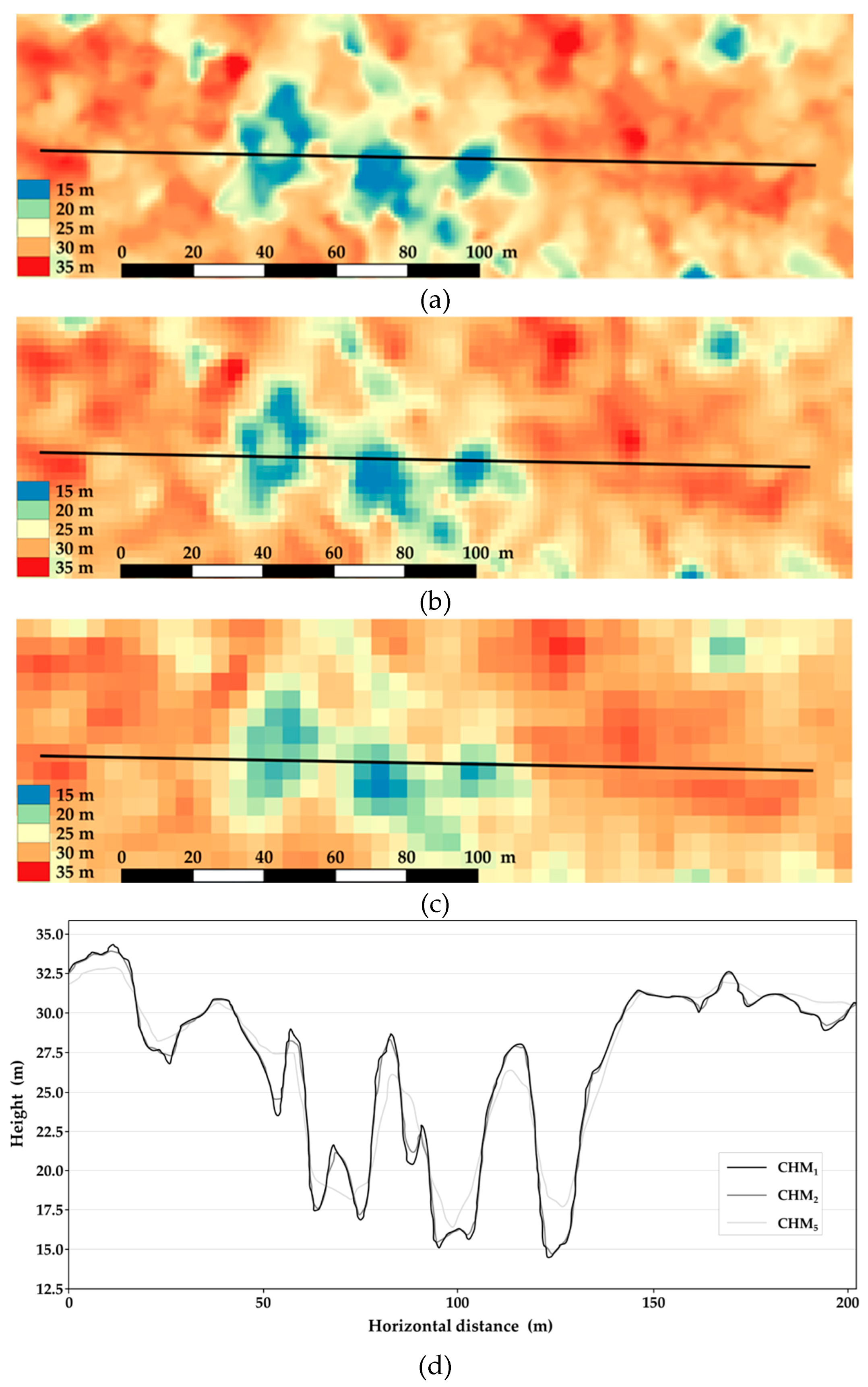 30], CHMs of lower spatial resolution facilitate faster data manipulation and processing, especially for larger areas. Images of lower spatial resolutions or point clouds of lower densities, together with the lower amount of extracted metrics, occupy a smaller storage size than CHMs of high spatial resolution or very dense point clouds. Therefore, the trade-off between spatial resolution and required accuracy for a given area should be identified.
