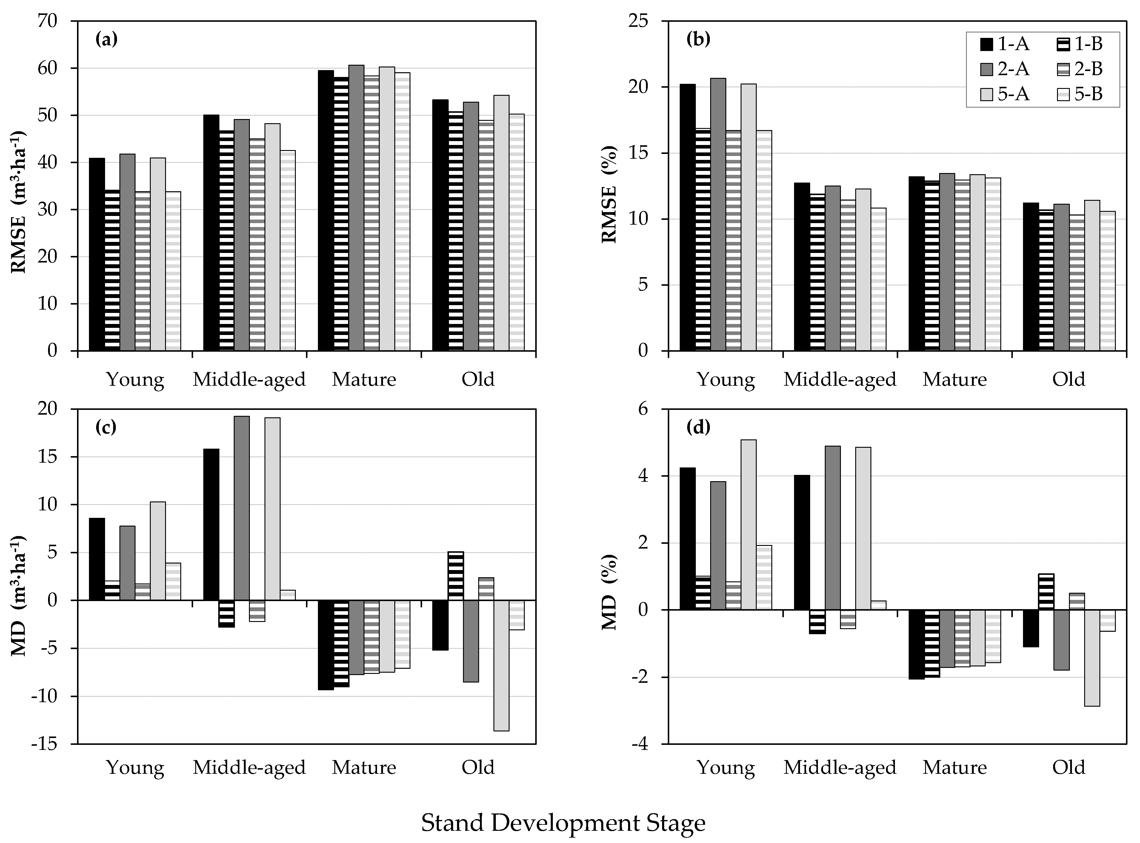Figure 4 shows validation results by stand development stages. Overall, the highest RMSEs