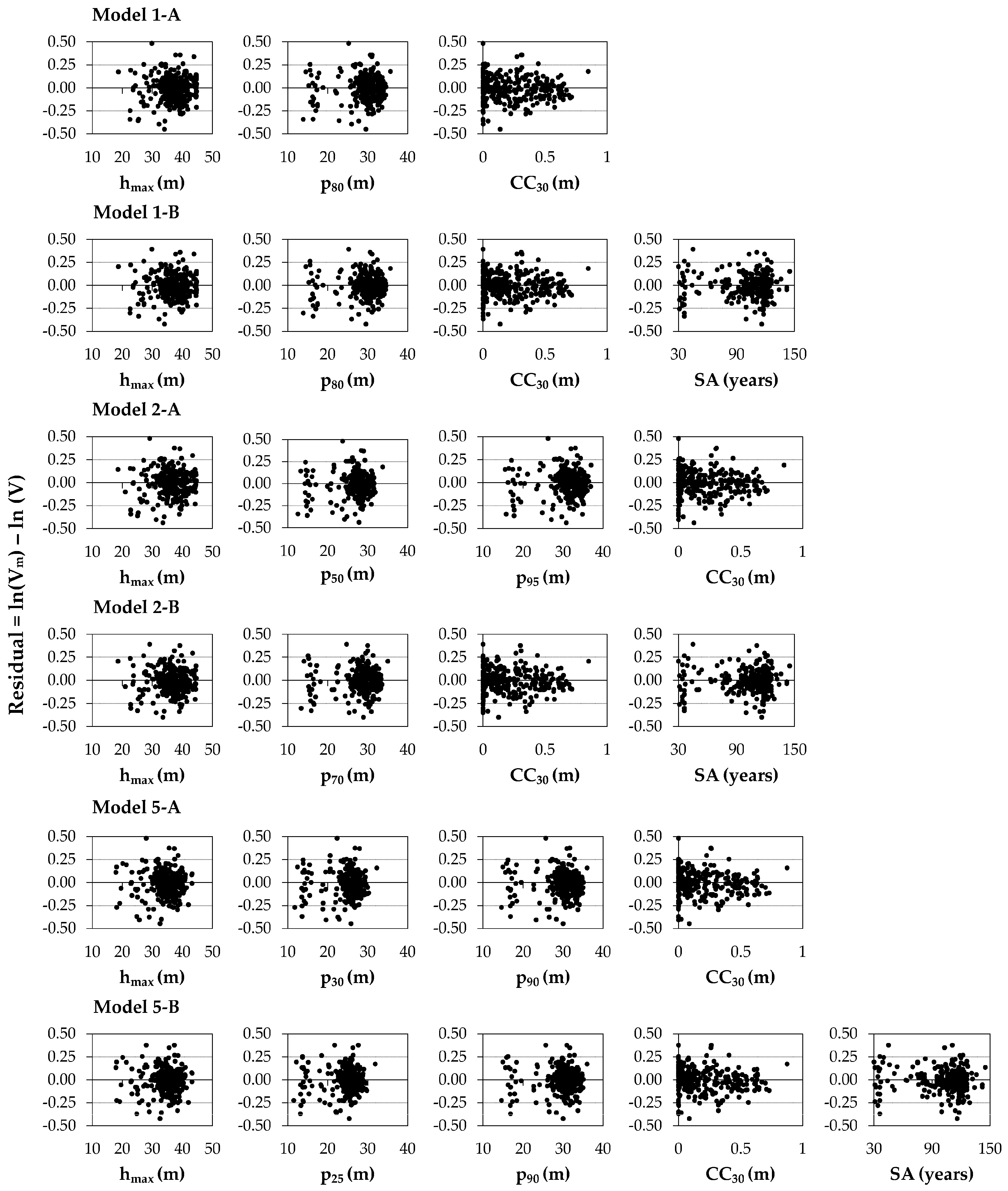 −1. To further characterize models’ performance and relationships between dependent and independent variables, scatterplots of residuals vs. independent variables are given in