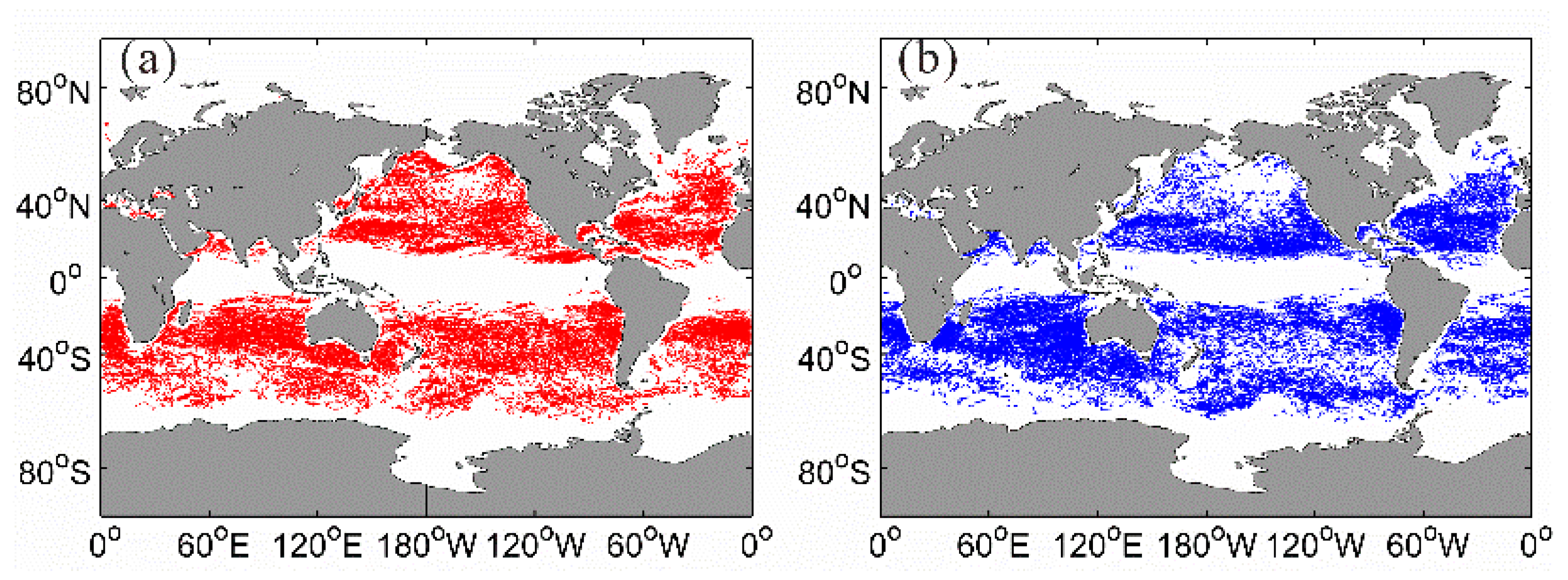 - Stammer, D. On eddy characteristics, eddy transports, and mean flow properties. J. Phys. Oceanogr. 1998, 28, 727–739. [Google Scholar] [CrossRef]