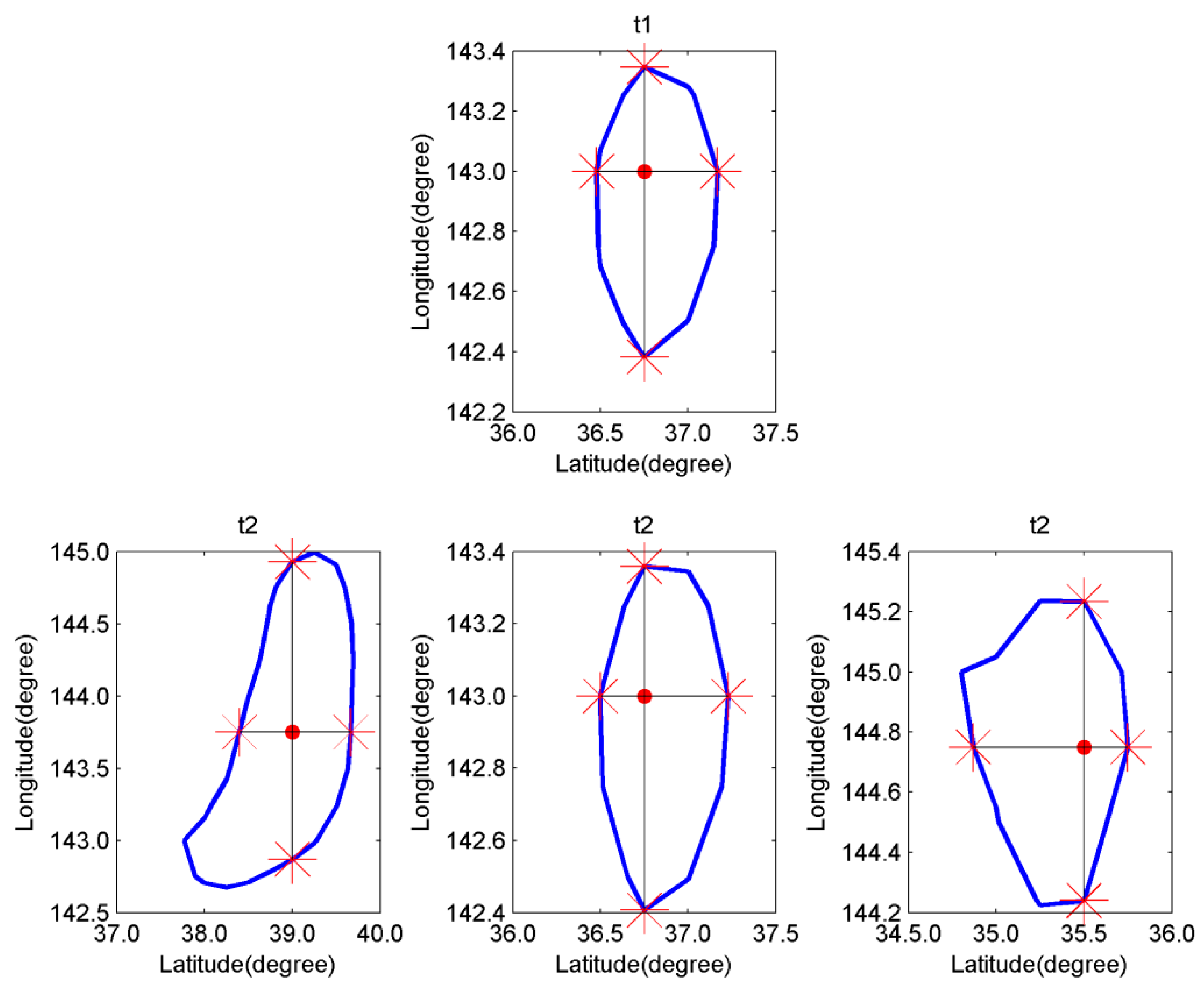 - Selecting: After setting the search range, a selection procedure is carried out. Eddies within the search range at time step t+1 are candidate eddies if their area and amplitude are between 0.25 and 2.75 times those of the current eddy. When candidate eddies exist, the HD is calculated between the boundary of each candidate eddy and the current eddy boundary, and the candidate eddy with the minimum HD is selected as the next eddy. To account for the transient “disappearance” of the mesoscale eddies from the sea surface, we also allow eddies to “disappear” for one time step while tracking. Meanwhile, we expand the search area based on the propagation distance. Of course, we could perform the calculation using a larger number of time steps, but that is not the point of this paper. When no candidate eddy exists at time step t+1, a similar selection process is conducted at time step t+2 to find the next eddy. When no eligible eddy can be found at time step t+1 or t+2, the track of this eddy is stopped at time t. During this procedure, the selected eddy is flagged as true, while non-selected eddies are flagged as false.