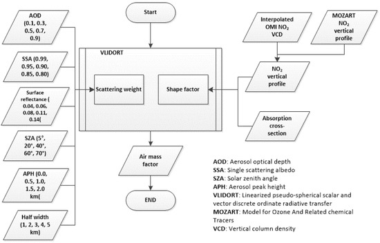 where AMFG is the geometric AMF; IB represents the backscattered intensity observed by the satellite instrument; τ is the optical thickness; α(z) and n(z) are the absorption cross-section (m2·molecules−1) and number density (molecules·m−3), respectively; z denotes each vertical layer; G is the molecular (trace gas) absorption optical depth; R is the molecular (Rayleigh) scattering optical depth; and A is the aerosol extinction optical depth [10]. In addition to NO2 column density, aerosol extinction vertical shape has an effect on NO2 AMF, as the vertical shape influences the scattering weight at each layer. In this study, AMF was computed using linearized pseudo-spherical scalar and vector discrete ordinate radiative transfer (VLIDORT, version 2.6). A detailed description of VLIDORT and its utilization for AMF calculation is provided by [10]. In the present study, AMF was computed at 440 nm, as the spectral fitting is carried out over a wavelength interval of 430–450 nm where there exist four strong NO2 absorption bands. Figure 1 presents a summary of the AMF computation. We calculated the scattering weight using AOD, SSA, surface reflectance, SZA, VZA, APH and HW, while the shape factor was calculated using the NO2 vertical profile and absorption cross-section. A description of each input parameter follows.