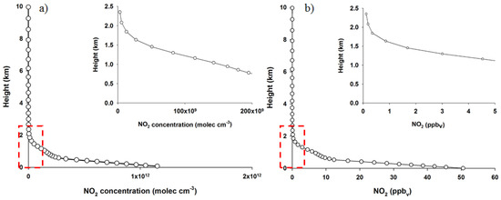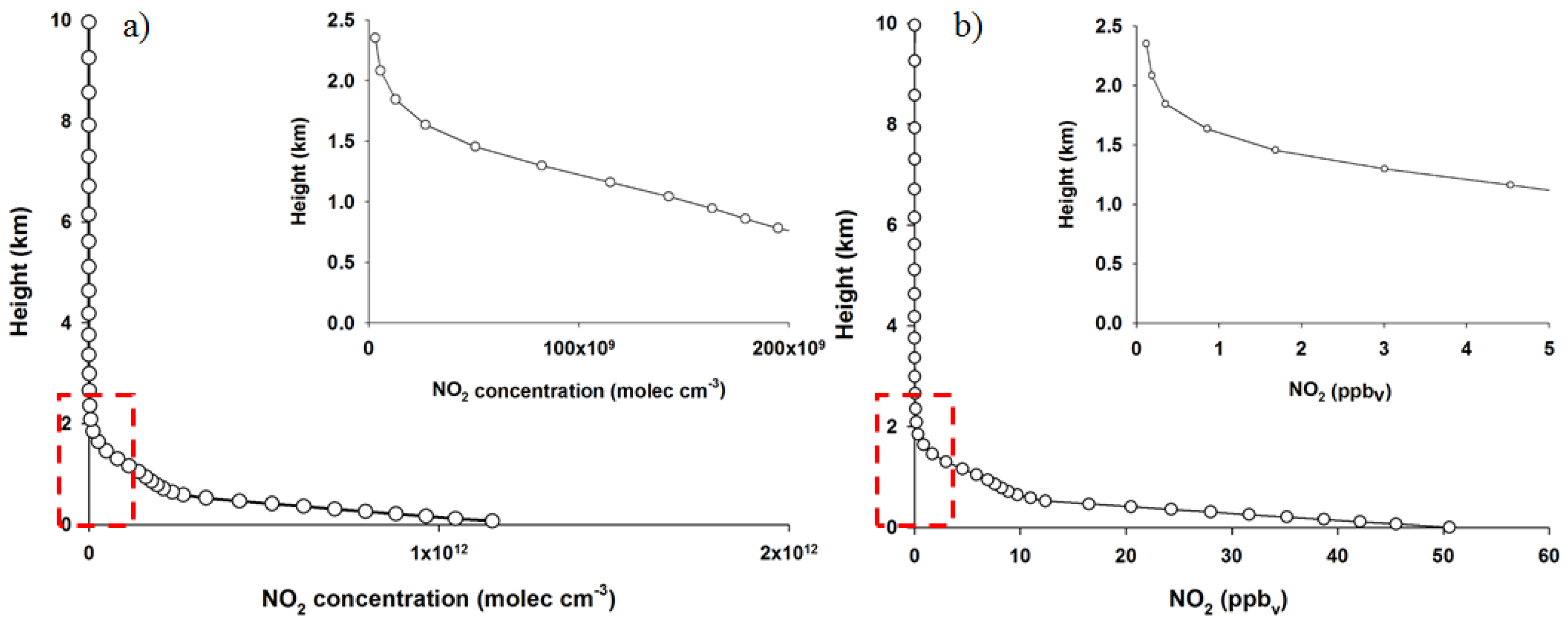 NO2 profile from the surface to 10 km, as obtained from MOZART-4 by: (a) concentration; and (b) mixing ratio.