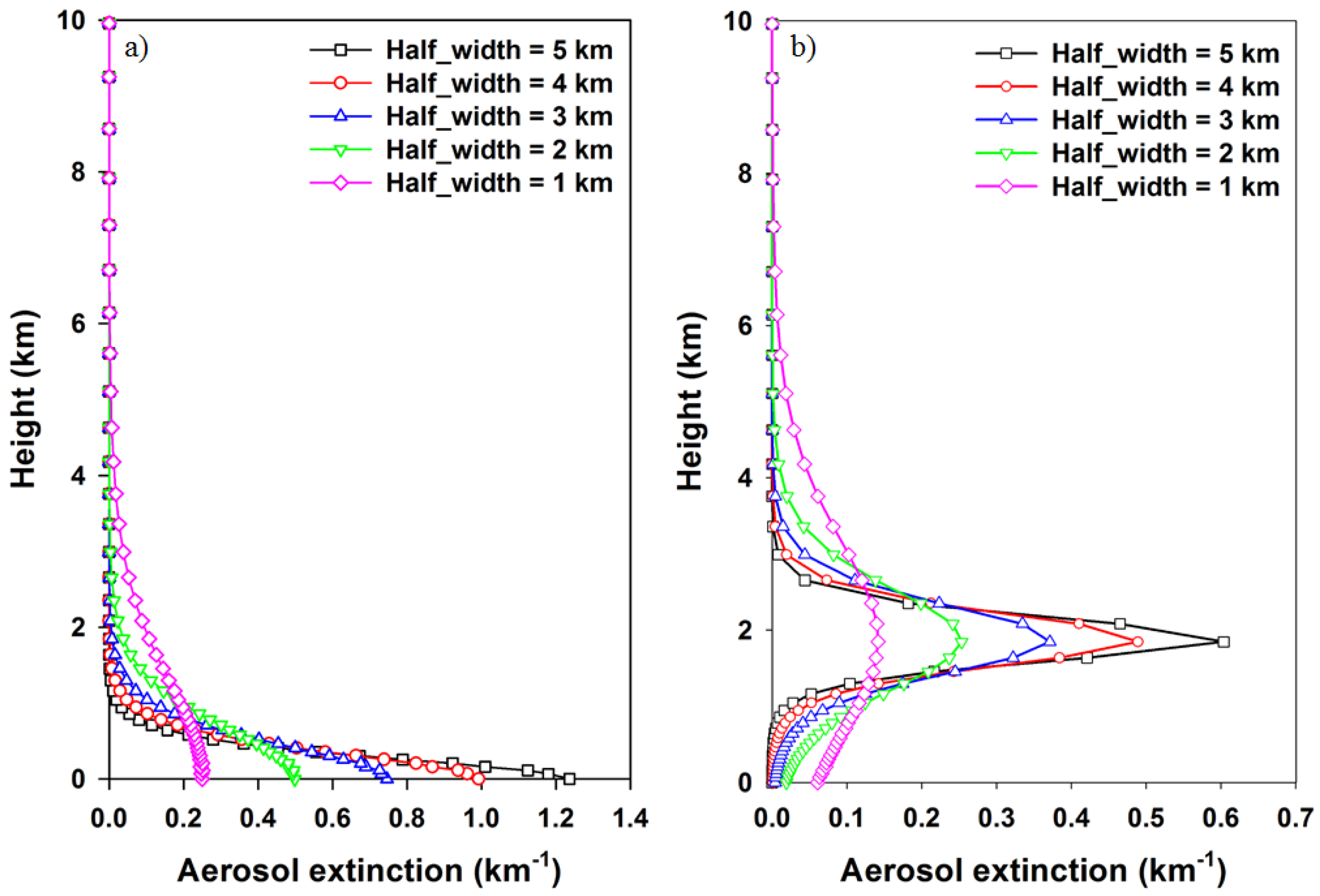 Vertical profiles of the aerosol extinction coefficient with an APH of: (a) 0 km; and (b) 2 km for various HW.