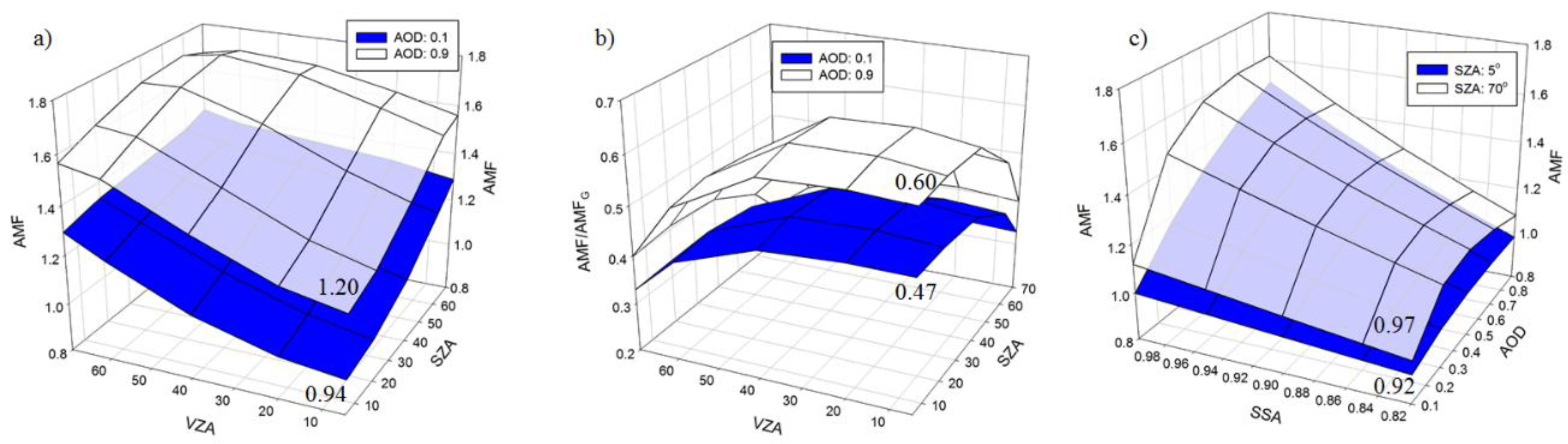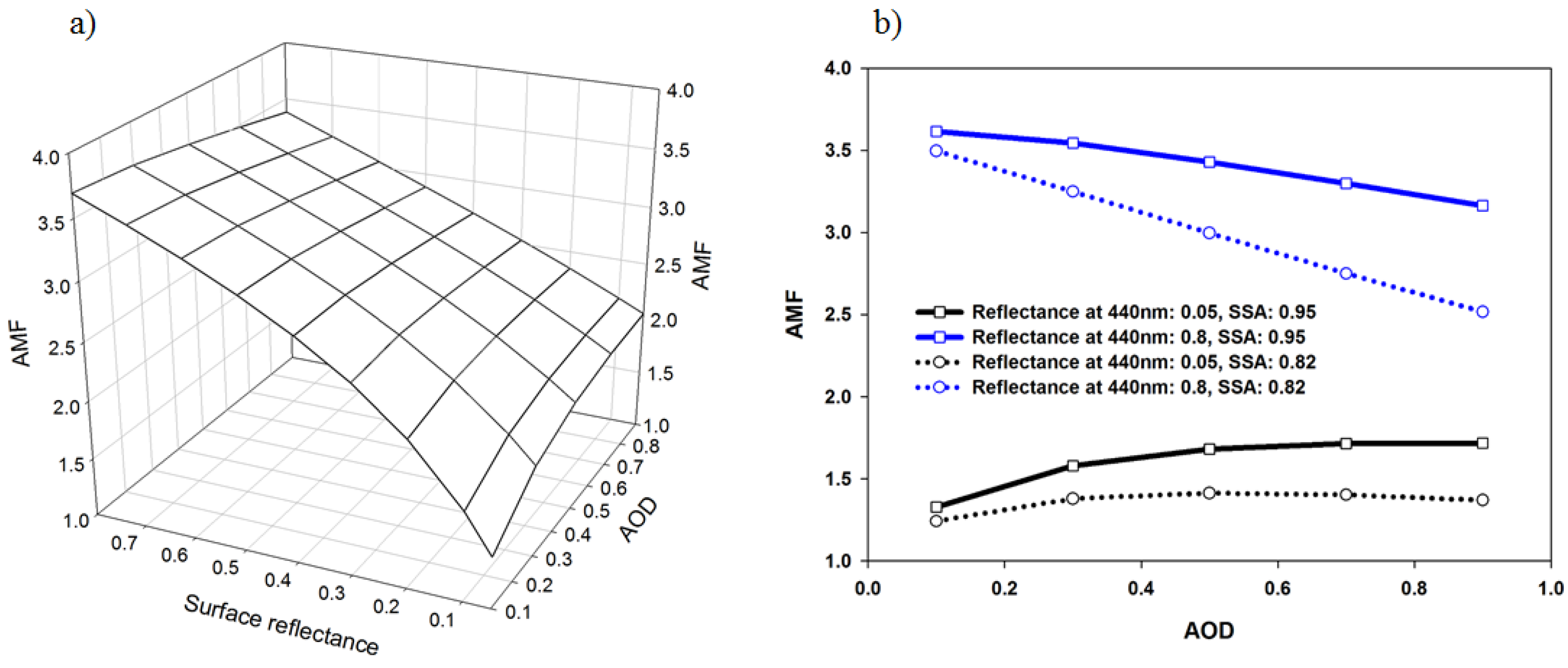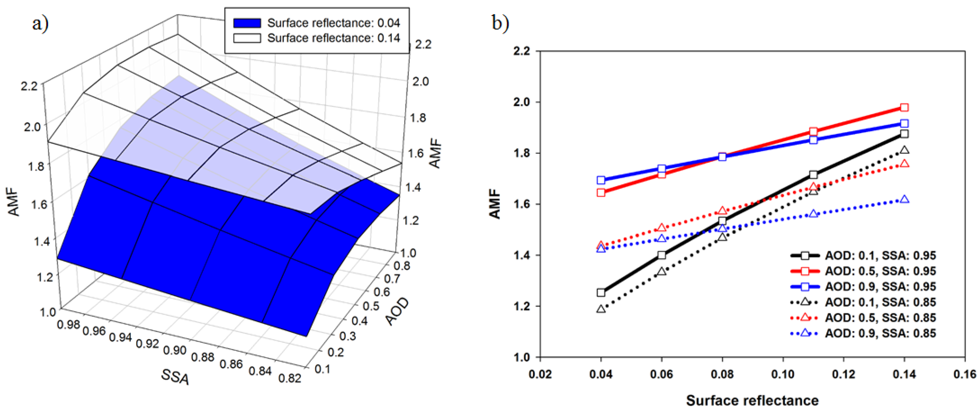 AMF was calculated using surface reflectance from 0.4 to 0.14, which covers values typical of grassland, ocean, and deciduous forests in the UV-VIS range, because surface reflectance also has a major influence on AMF and varies with surface type.