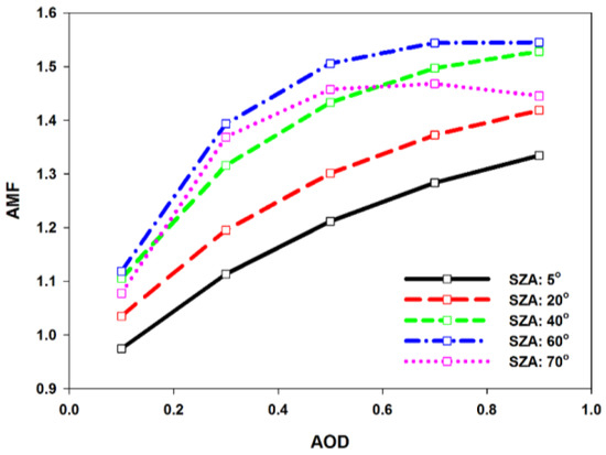 AMF change as a function of SZA and AOD under conditions of surface reflectance = 0.05, VZA = 47°, RAA = 50°, wavelength = 441 nm, APH = 0 km, HW = 4 km, and SSA = 0.95.