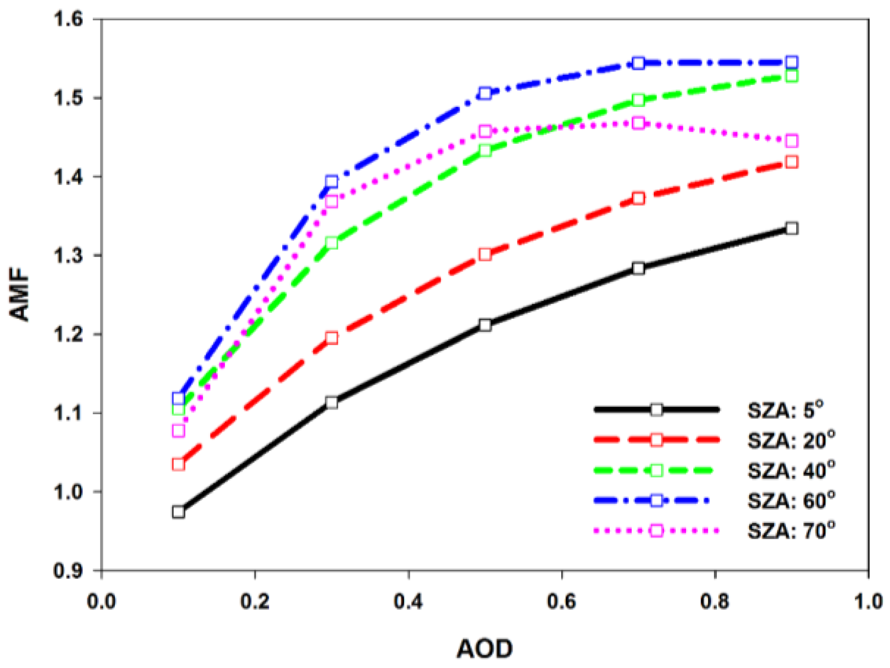 - Lastly, we investigated the effect of aerosol shape on AMF, The AMF difference between spherical and non-spherical aerosol shape becomes large at the conditions of high AOD, low APH and RAA of 0° (Figure 11).