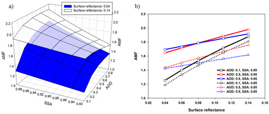 Surface reflectance is an important factor in determining NO2 AMF. Leitão et al. [2] reported that a change in surface reflectance from 0.01 to 0.1 can result in an increase in NO2 AMF by ~90%. According to [21], the minimum Lambertian-equivalent reflectance values at 400 nm are 0.05, 0.06 and 0.07 for deciduous forests, grassland, and ocean, respectively. However, no previous study has investigated the effects of high surface reflectance under various AOD and SSA conditions on AMF where the Lambertian-equivalent reflectance values are as low as 0.5 and 0.8, such as on refreezing ice and fresh snow [22]. We compared the effect of high and low surface reflectance values on AMF for various AOD and SSA values, as shown in Figure 6a. The NO2 AMF tends to increase with increasing surface reflectance at high-NO2 site. The NO2 AMF for an AOD of 0.1 and SSA of 0.95 increases by 49.6% (from 1.25 to 1.87) at the high-NO2 site when the surface reflectance is 0.04 and 0.14, respectively. Figure 6b shows the variations in NO2 AMF at high-NO2 site as a function of surface reflectance under various AOD and SSA conditions. NO2 AMF increases with increasing surface reflectance between 0.04 and 0.14. However, the increasing rate in NO2 AMF as a function of surface reflectance decreases with increasing AOD values due to the increased aerosol shielding effect. In the case of AOD = 0.1 and SSA = 0.85, the NO2 AMF increases by 38.66% (from 1.19 to 1.65) as surface reflectance changes from 0.04 to 0.14. In the case of AOD = 0.9 and SSA = 0.85, NO2 AMF increases by 14.08% (from 1.69 to 1.92) when surface reflectance changes from 0.04 to 0.14. NO2 AMF values under high-SSA conditions are always larger than those in the case of low SSA values, and the influence of SSA is much greater under high-AOD conditions.