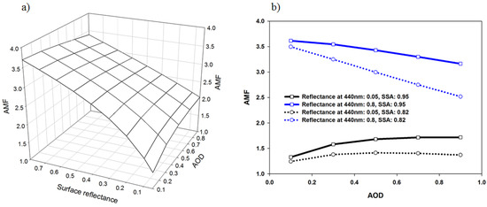 (a) AMF change as a function of AOD and surface reflectance (SZA = 60°; VZA = 47°; RAA = 50°; wavelength = 441 nm; APH = 0 km; and HW = 4 km). (b) AMF change as a function of AOD and SSA for deciduous forest (0.05) and snow surface (0.8) reflectance.