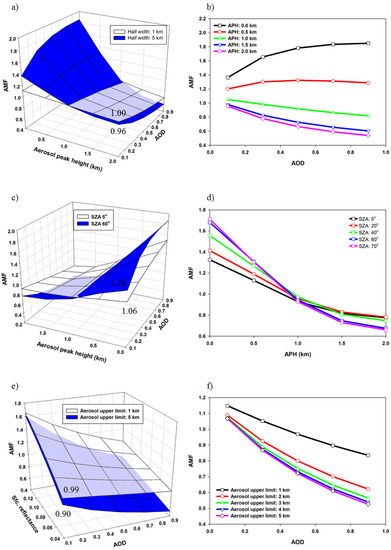(a) AMF change as a function of AOD, APH, and HW; (b) AMF change as a function of AOD and APH; (c) AMF change as a function of AOD, APH, and SZA at HW 5 km; and (d) AMF change as a function of APH and SZA at HW 5 km (SZA = 60°; VZA = 47°; RAA = 50°; SSA = 0.95; and surface reflectance = 0.05); (e) AMF change as a function of AOD, surface reflectance and aerosol upper limit under rectangular distribution cases of aerosol; and (f) AMF change as a function of AOD and aerosol upper limit.