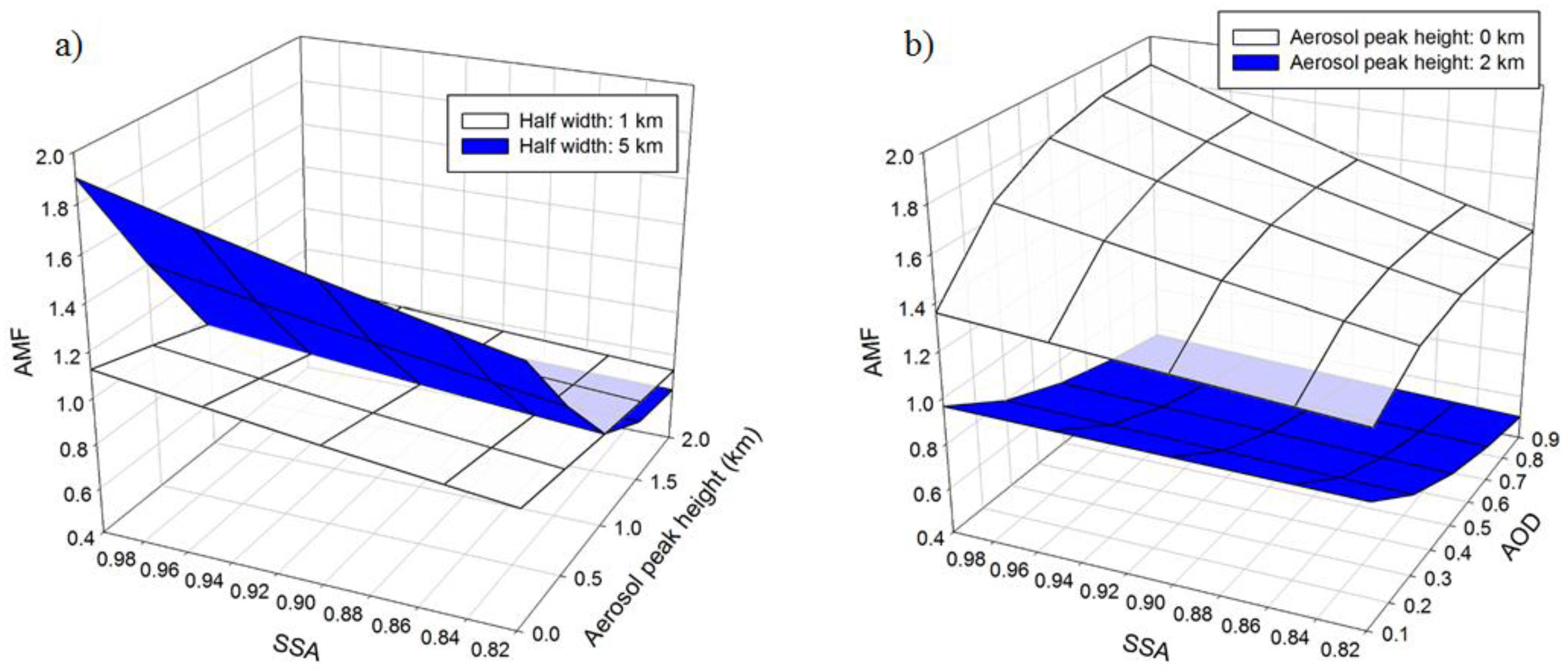 We additionally examined the APH effect on AMF under various AOD and SSA conditions. Figure 9a shows the NO2 AMF variation due to changes in SSA, APH, and HW at AOD = 0.5; the effects of AOD, SSA, and APH on NO2 AMF are shown in Figure 9b. NO2 AMF decreases with decreasing SSA since the absorbing aerosol contributes to a decreased light path. When SSA changes from 0.99 to 0.82, and APH = 0 km and HW = 5 km, the NO2 AMF decreases by 21.05% (from 1.90 to 1.50) in cases of APH = 0 km, but for HW = 1 km the AMF decreases only by 17.86% (from 1.12 to 0.92). The decrease in NO2 AMF is greater at high HW than at low HW, which implies an enhancement of the shielding effect of the aerosol layer due to high HW. The AMF is reduced by 12.1% (from 0.57 to 0.50) when SSA is changed from 0.99 to 0.82 under conditions of AOD = 0.9 and APH = 2 km. Under the same AOD and SSA conditions, but with APH = 0 km, the AMF is reduced by 26.8% (from 1.87 to 1.37), which shows the higher sensitivity of AMF to the changes in SSA under low-APH conditions.