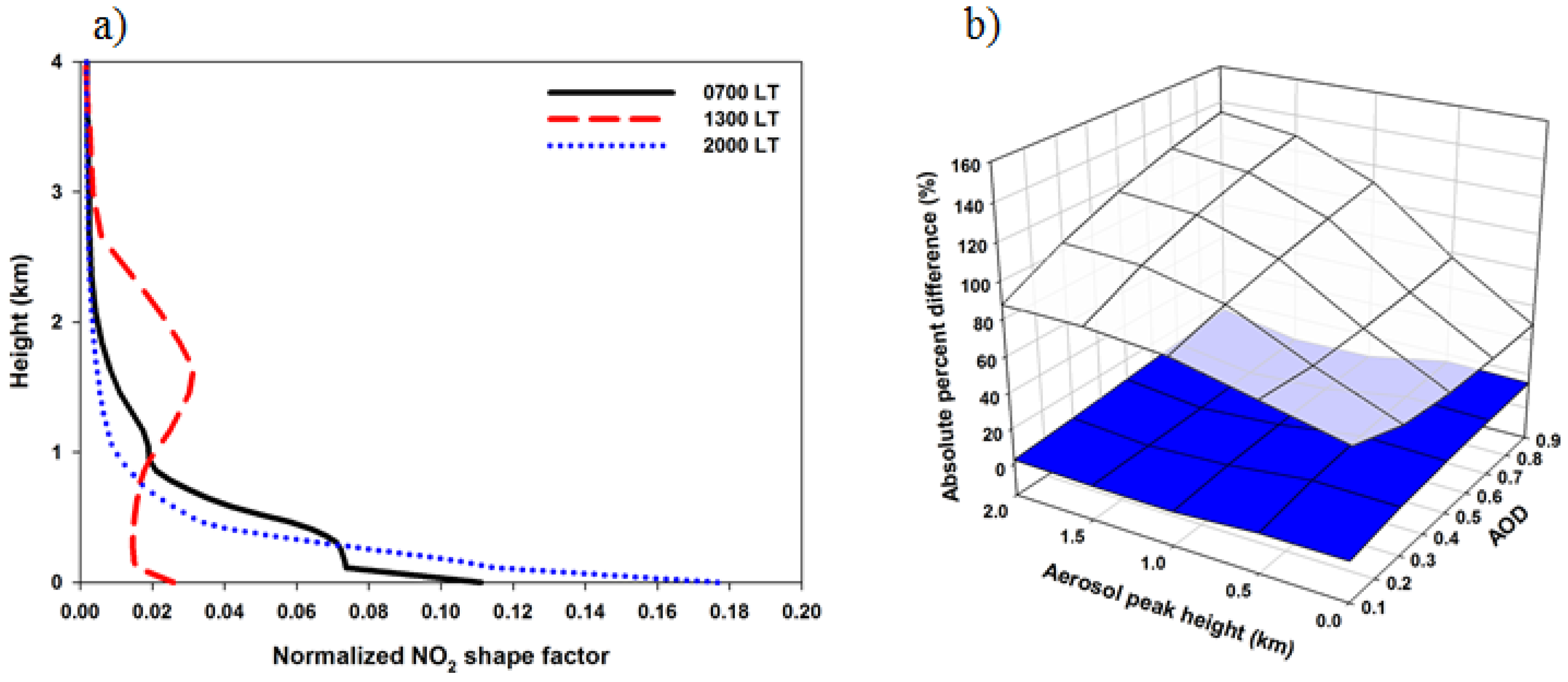- An investigation of the simultaneous effects of aerosol peak height (APH), various aerosol properties (e.g., AOD, SSA, and aerosol shape), and geometric information on the AMF for NO2 retrieval.